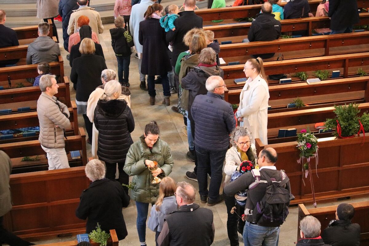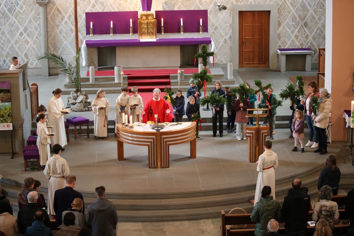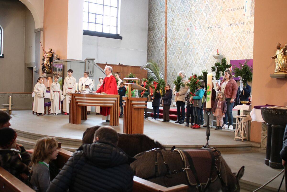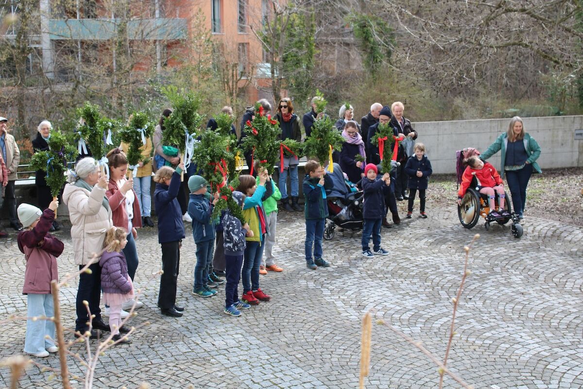 Mit selber gebundenen Palmkreuzen und den Eseln der Familie Brändle-Benz von der Beckenhalden zogen wir in die Kirche St.Georgen ein und feierten die Ankunft von Jesus in Jerusalem.