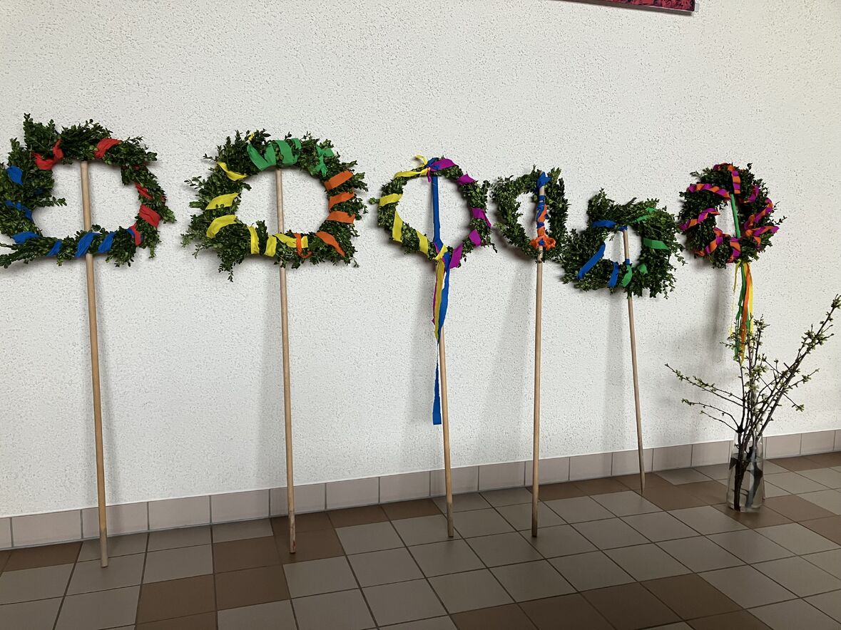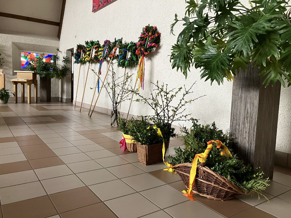 Auch dieses Jahr haben wir mit einer bunten Schar von Kindern in der Ökumenischen Gemeinde Halden Palmstecken gebunden. Kinder und Erwachsene waren fleissig und kreativ mit dabei. So entstanden fröhliche Palmstecken, die die Kindern dann am Palmsonntag stolz bei der kleinen Prozession rund um die Haldenkirche mitgetragen haben.