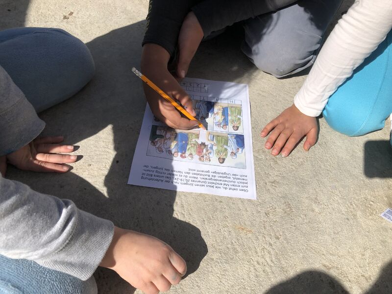 Bei der Kirche Kunterbunt am Ostermontag waren die Familien an verschiedenen Posten im Stiftsbezirk unterwegs – wie die Emmausjünger auch unterwegs waren. Es wurde um die Wette gerannt, Eier kreativ eingewickelt und verpackt, damit sie einen Sturz aus dem 2. Stock überstehen, Dankgebete über die Auferstehung geschrieben und mit Ballonen in den Himmel geschickt. Es gab echte Häschen zum Streicheln und Füttern, eine fröhliche Feierzeit mit fetziger Musik und ein feines Mittagessen für alle.