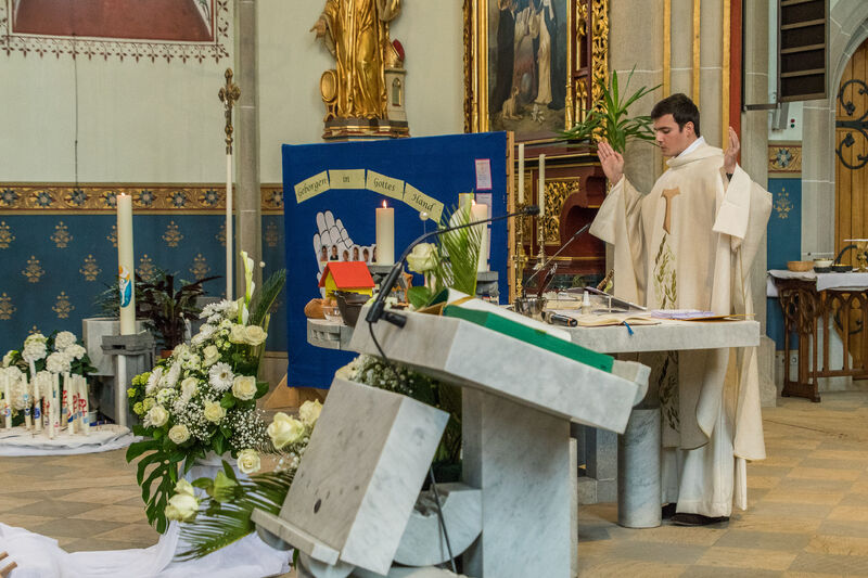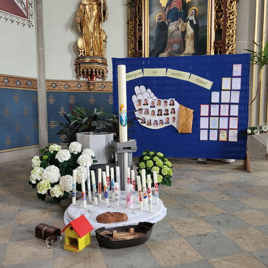 Das Grundthema "Geborgen in Gottes Hand" begleitete die Feier über die Texte und Fürbitten der Kinder und die Predigt der Pfarreibeauftragten Brigitta Schmid. Sie betonte den Halt, den Gottes Liebe allen Menschen gibt und wie dabei das kindliche Vertrauen allen als Vorbild und Wegweiser dienen kann. Danach empfingen die Kinder vom Jungpriester Ivan Saric zum ersten Mal die Heilige Kommunion.