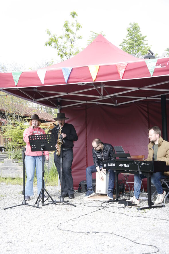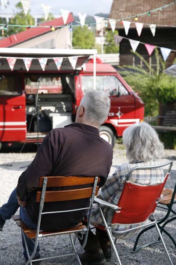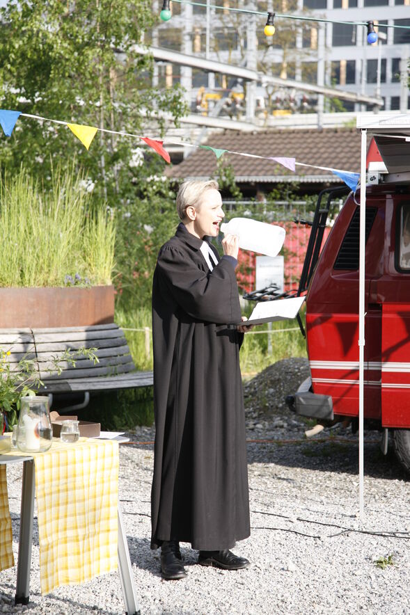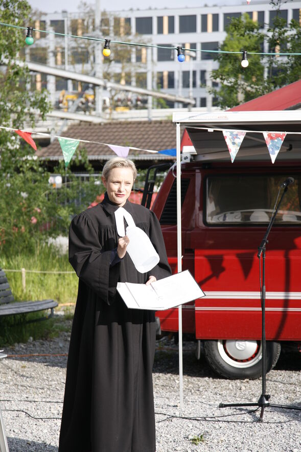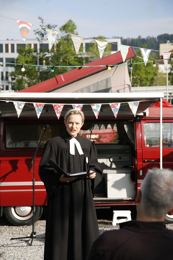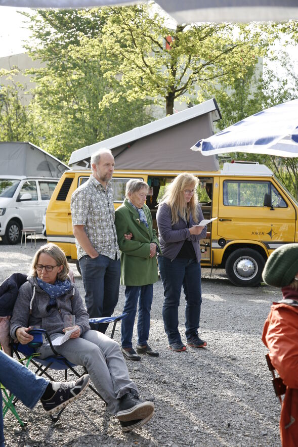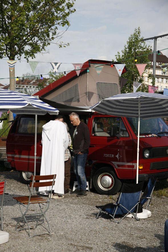 Neben einer Einzelsegnung für Camper:innen mit Segens-Vignette und Segens-Button gab es tolle Musik von Helena, Christian, Manuel und Roman und sogar einen Camper-Betruf, den Pfrn. Andrea Weihnhold extra für diese Segnung verfasst hat. Von Bulli über Wohnmobil bis Velo war alles mit dabei. Auch das Wetter hat mitgespielt und so konnten wir gemütlich bei Sonnenschein feiern - jede:r im eigenen Campungstuhl.