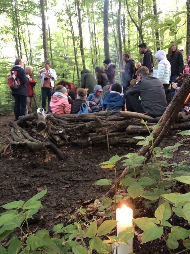 Fürh, sehr früh, für manche zu früh haben sich am Pfingstmontag auf dem Kirchplatz der katholische Rotmonten Familien der ganzen Seelsorgeinheit St. Gallen Ost getroffen um miteinander den Tagesanbruch im Wald zu erleben. Dann, wenn es im Wald noch dunkel ist, ist der Tagesbeginn am eindrücklichsten: die Vögel kündigen den anbrechenden Morgen an. Auf Mätteli in warme Jacken aneinander gekuschelt und an Bäumen angelehnt haben rund 40 Personen ab 4 Uhr morgens muxmäuschenstille gewartet, bis die ersten Vögel zu singen begonnen haben.