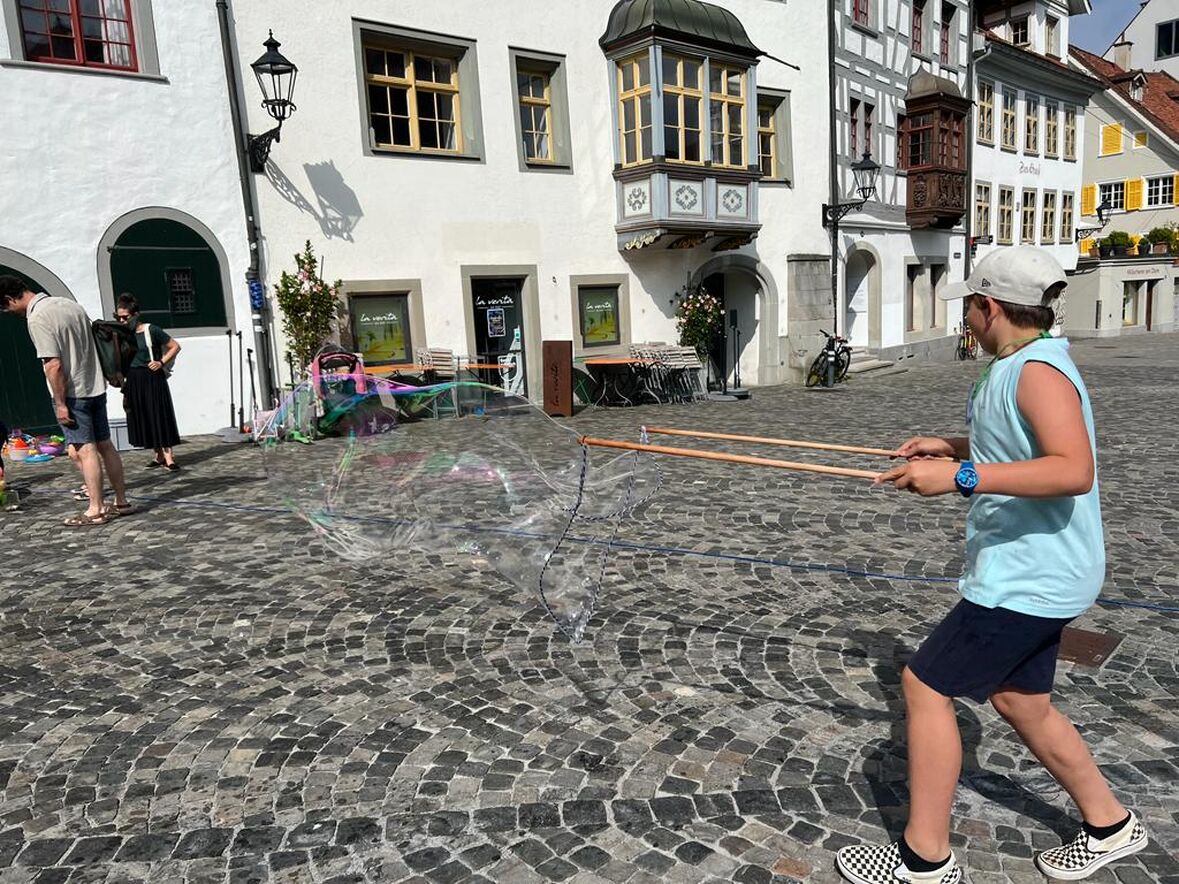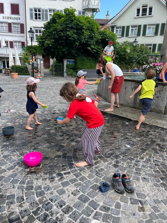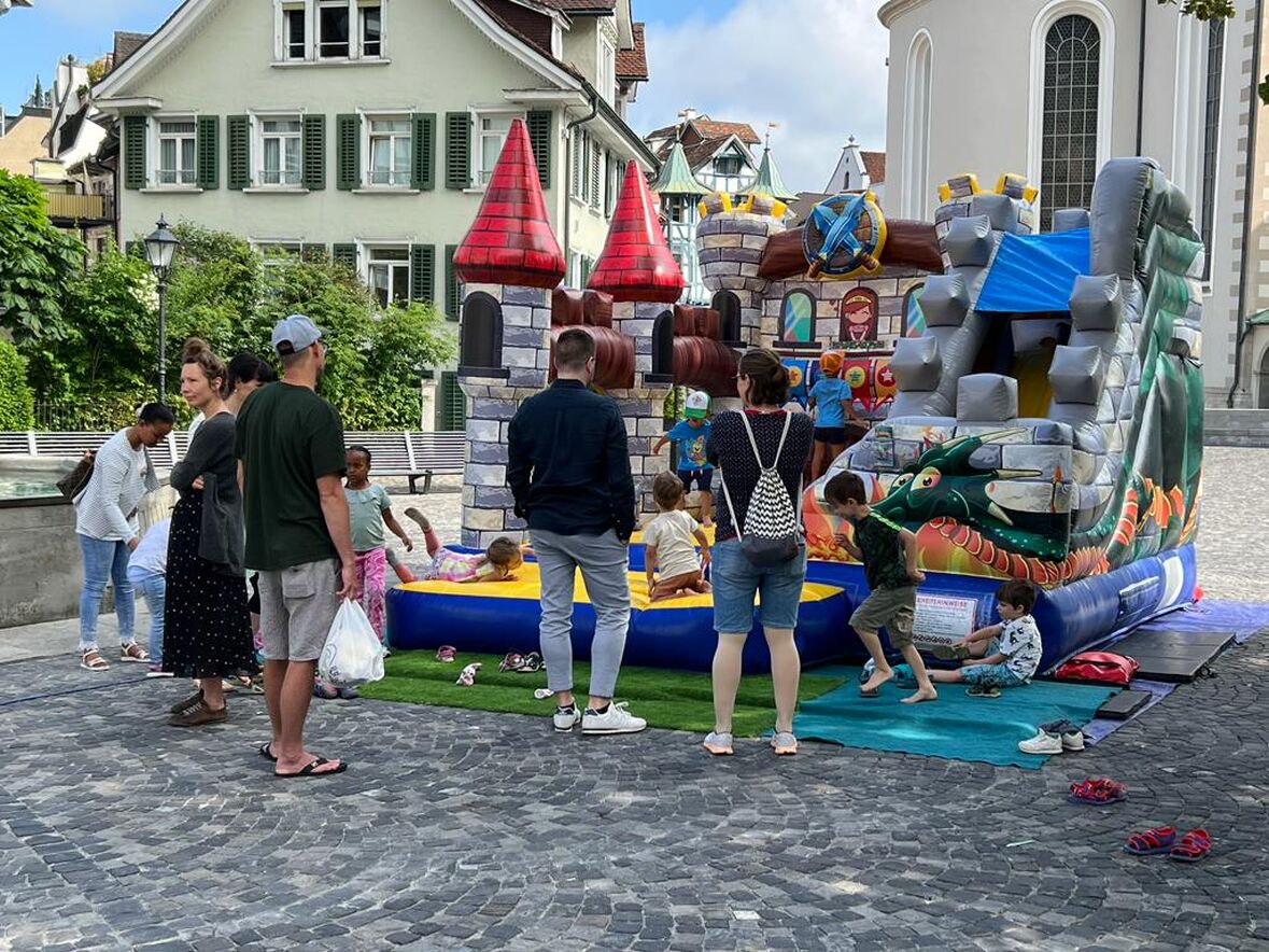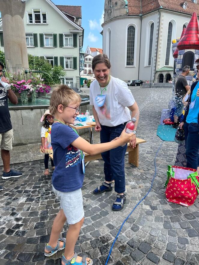Mitten auf dem Gallusplatz wurde viel gelacht, gespielt, gerannt, gehüpft und hin und her gesaust. Auch eine stimmungsvolle Feierzeit zur Taufe von Jesus mit kreativen Bausteinen und coolen Liedern stand auf dem Programm. Der krönende Abschluss war ein feines Mittagessen.