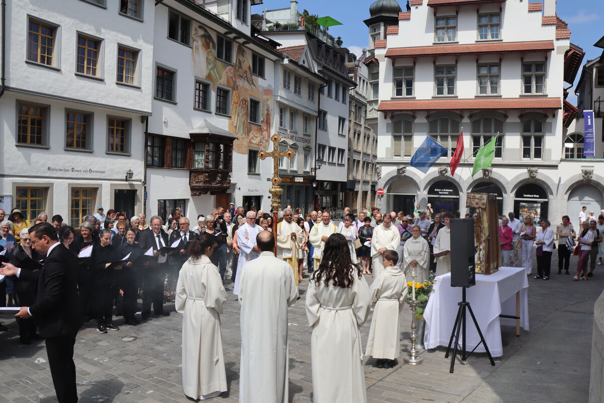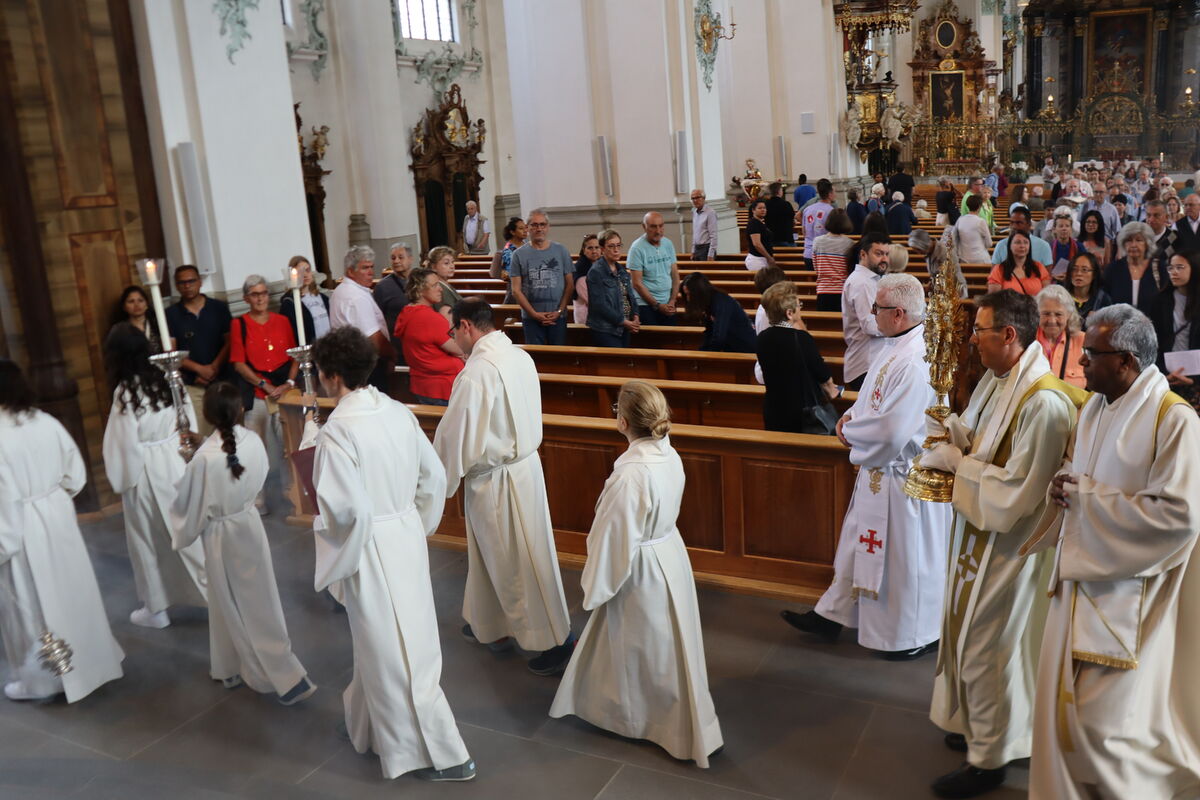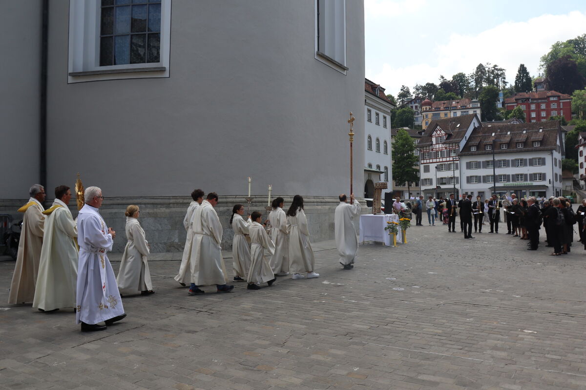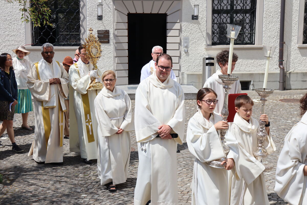 Zusammen mit unseren italienisch- und spanischsprachigen Mitchristen feierten wir Fronleichnam oder auch «Hochfest des Leibes und Blutes Christi» genannt. Wir feiern dann die Gegenwart von Jesus Christus im Sakrament der Eucharistie. Wort und Sakrament können nicht drinnen bleiben; sie müssen hinaus in die Welt. Deshalb zogen wir nach dem festlichen Hauptgottesdienst bei wunderschönem Wetter in einer Prozession um die Kathedrale.