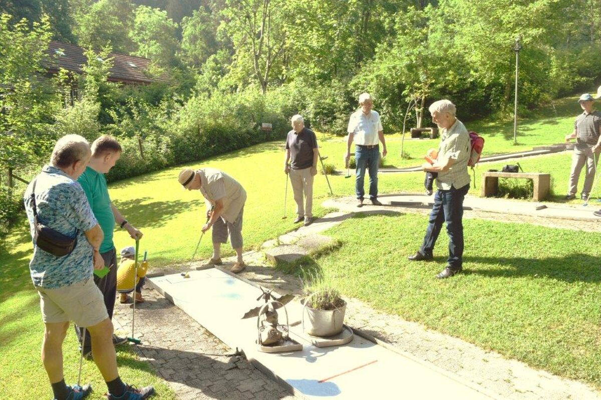 Eine Gruppe Männer versammelt sich auf Dreilinden zum gemeinsamen Minigolf-Spiel.