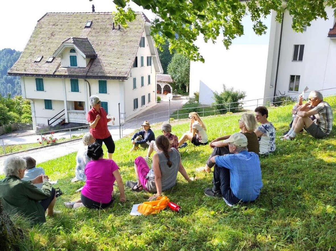 Vom Pilgerhaus Maria-Rickenbach unternahmen wir kleinere und grössere Wanderungen. Der Tag begann mit Körperübungen und -gebet. Nach dem Frühstück im Schweigen trafen wir uns zur Morgenbesinnung in der Kirche und starteten dann für eine gewisse Zeit im Schweigen auf unsere Wanderungen. Abends wurden wir wunderbar verwöhnt vom (Küchen-)Team des Pilgerhauses. Die Tage enden mit einer Besinnung in der Kirche. Fast... Nach der Abend-Besinnung kam noch das wunderbare Dessert...