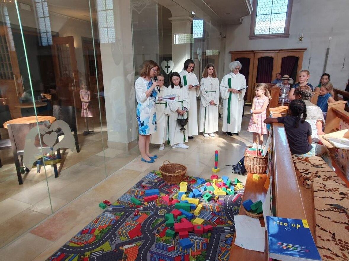 Das Team segnet die Spielecke, die bewusst auf Wunsch der Eltern hinten in der Kirche platziert ist.-