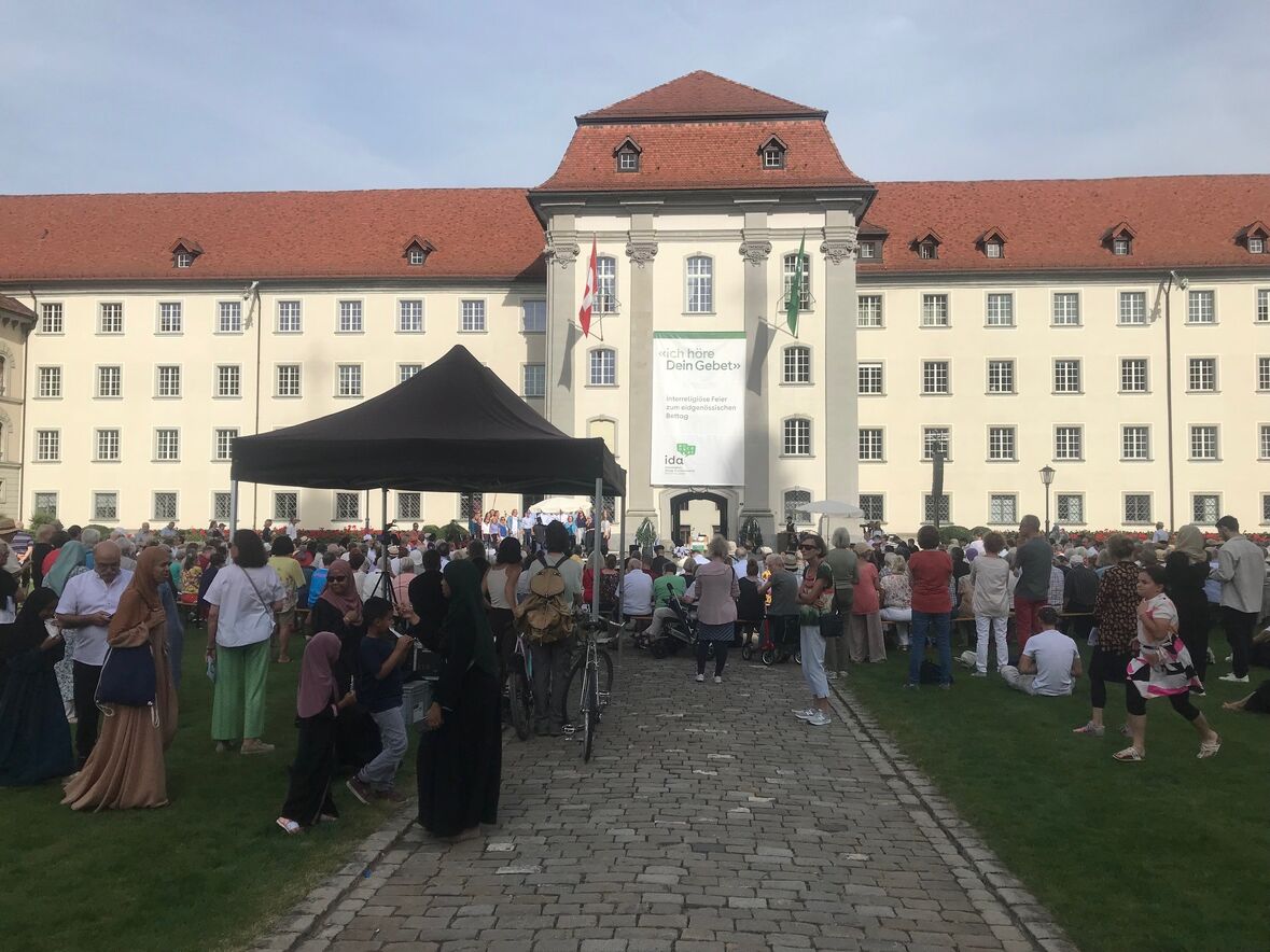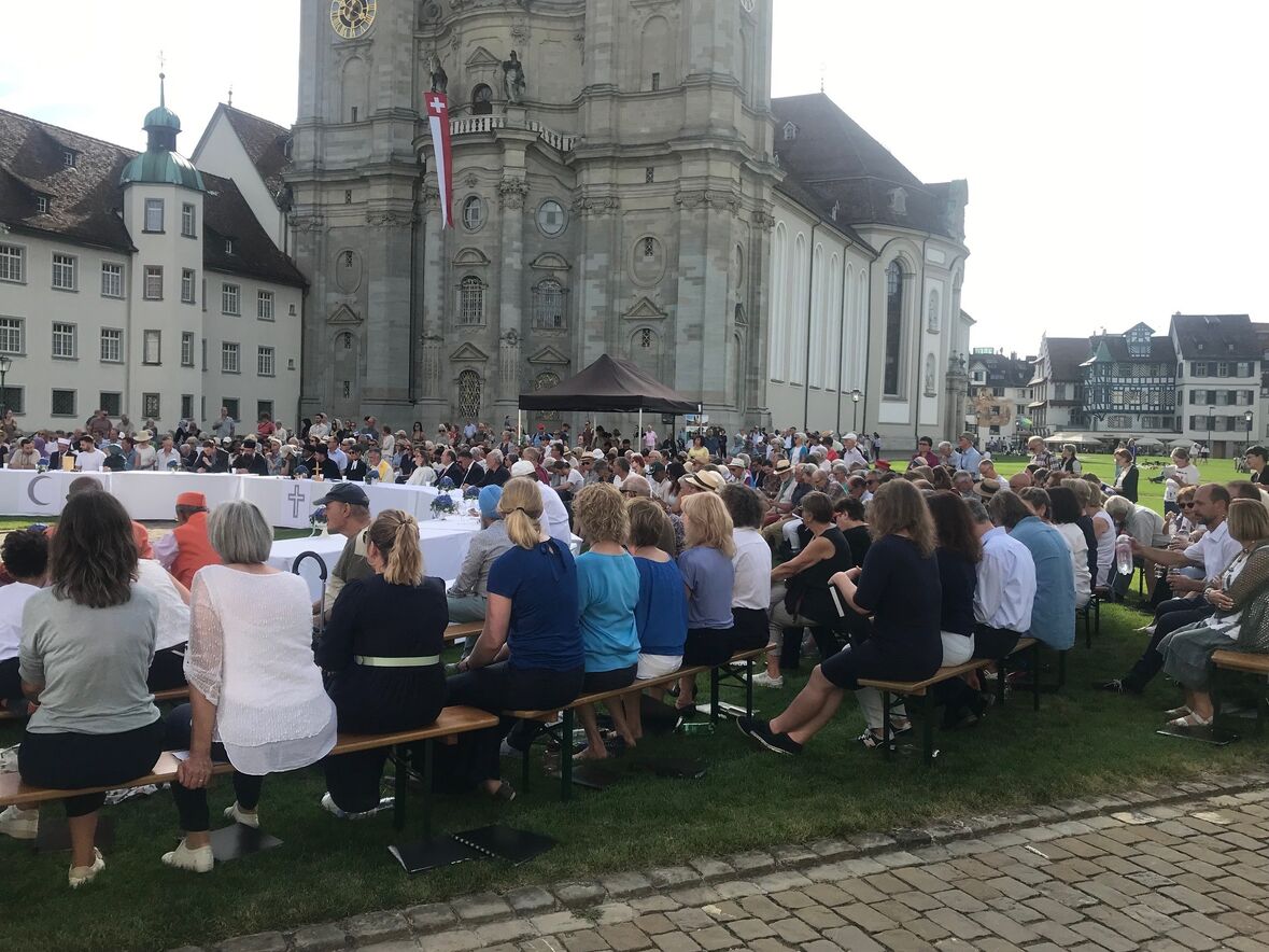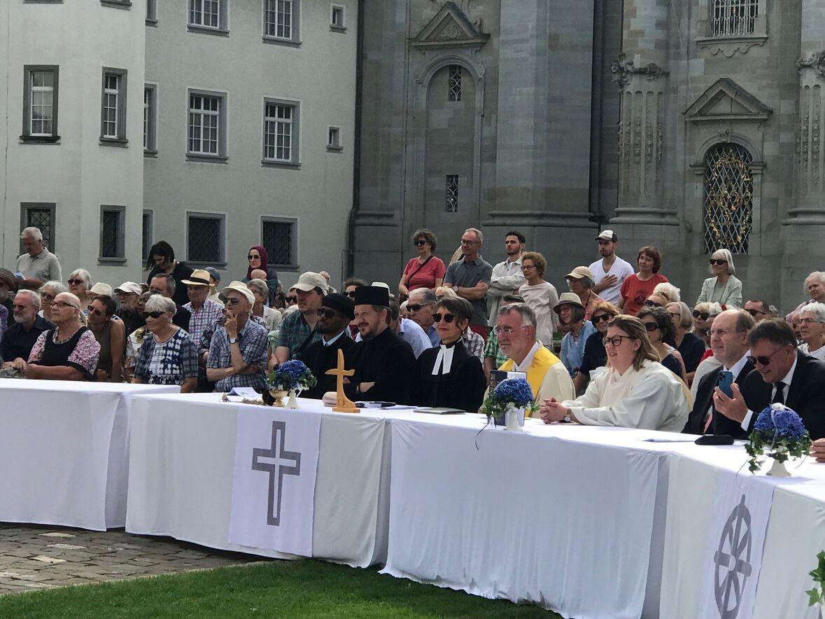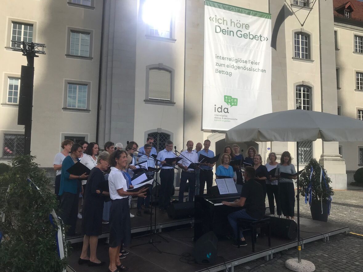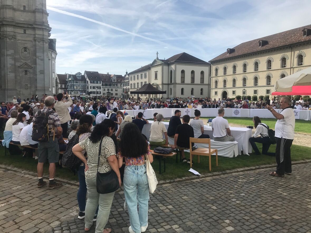 Im strahlenden Sonnenschein, zwischen Kathedrale, St. Laurenzen und Regierungsgebäude, feierten am Sonntag, 17. September 2023 rund 400 Menschen die «Interreligiöse Feier zum Eidgenössischen Dank-, Buss- und Bettag» in St. Gallen. Angehörige aus acht verschiedenen Religionen sangen, rezitierten und beteten um Frieden in der Welt.