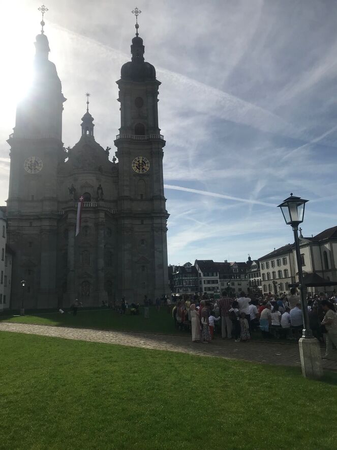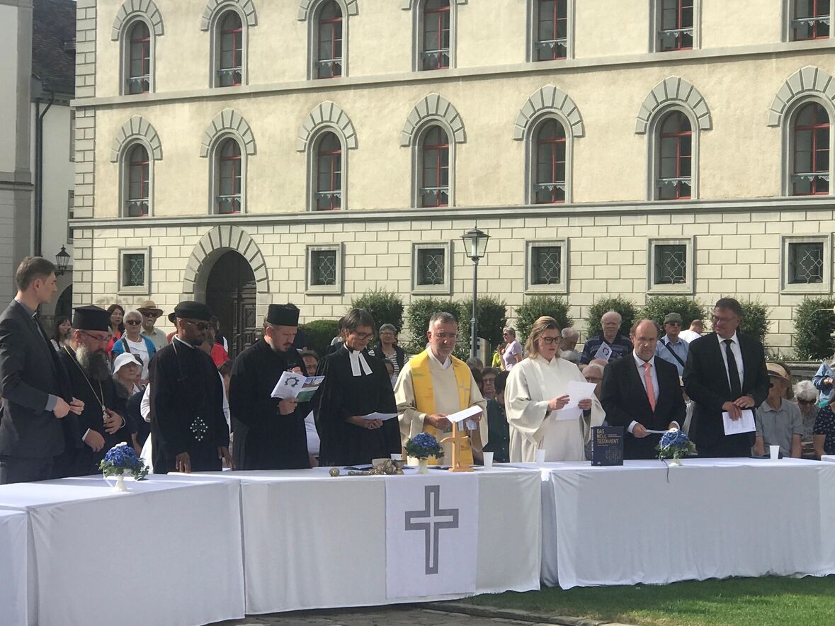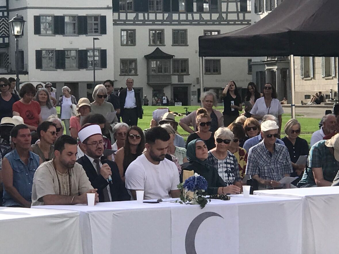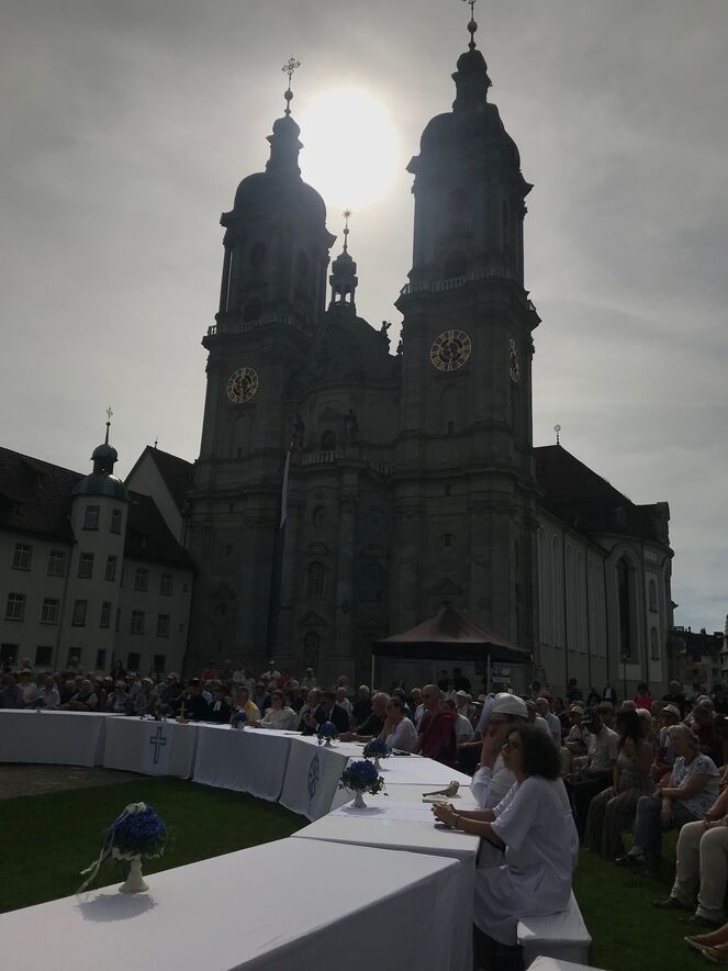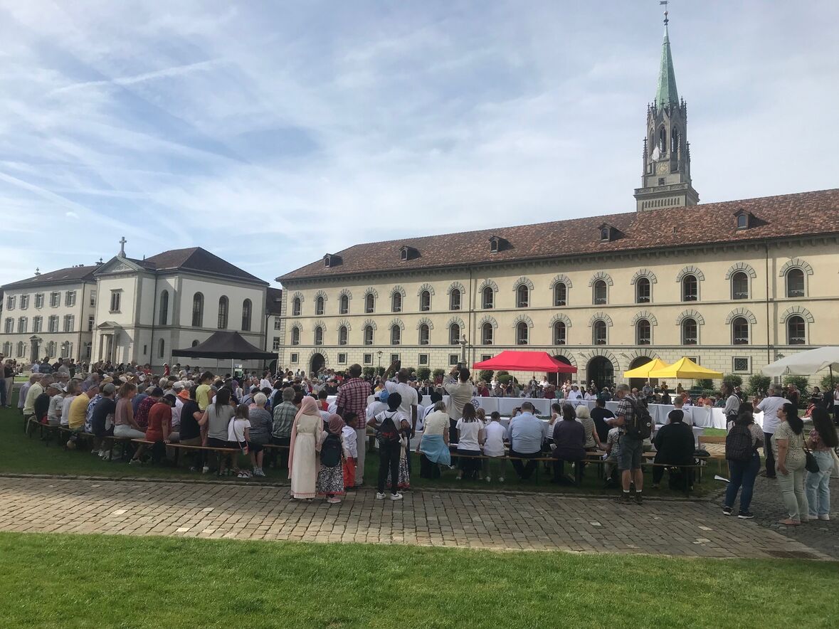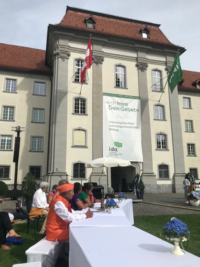 Im strahlenden Sonnenschein, zwischen Kathedrale, St. Laurenzen und Regierungsgebäude, feierten am Sonntag, 17. September 2023 rund 400 Menschen die «Interreligiöse Feier zum Eidgenössischen Dank-, Buss- und Bettag» in St. Gallen. Angehörige aus acht verschiedenen Religionen sangen, rezitierten und beteten um Frieden in der Welt.