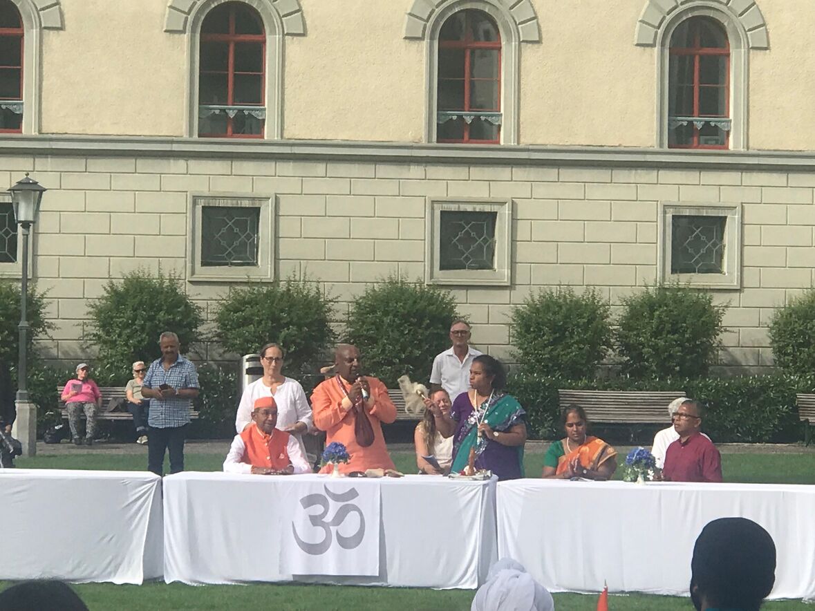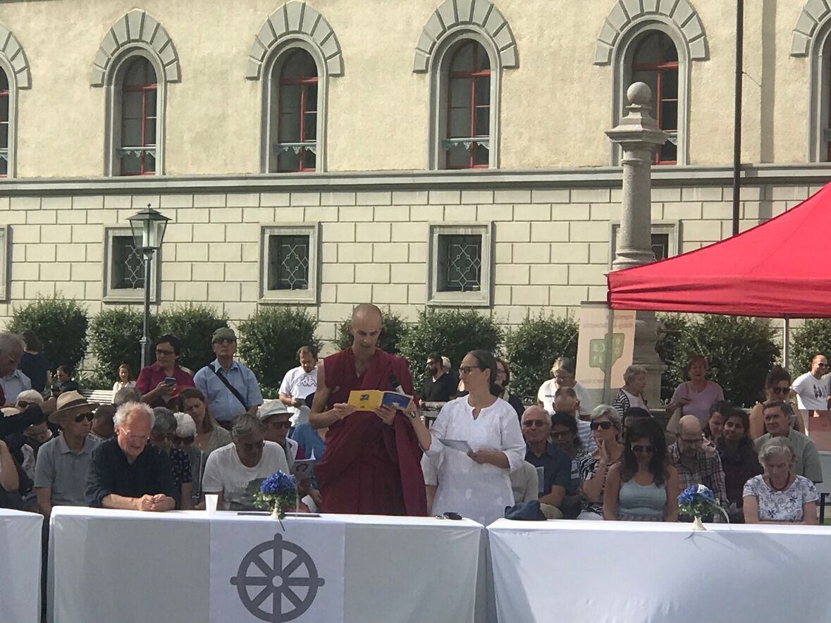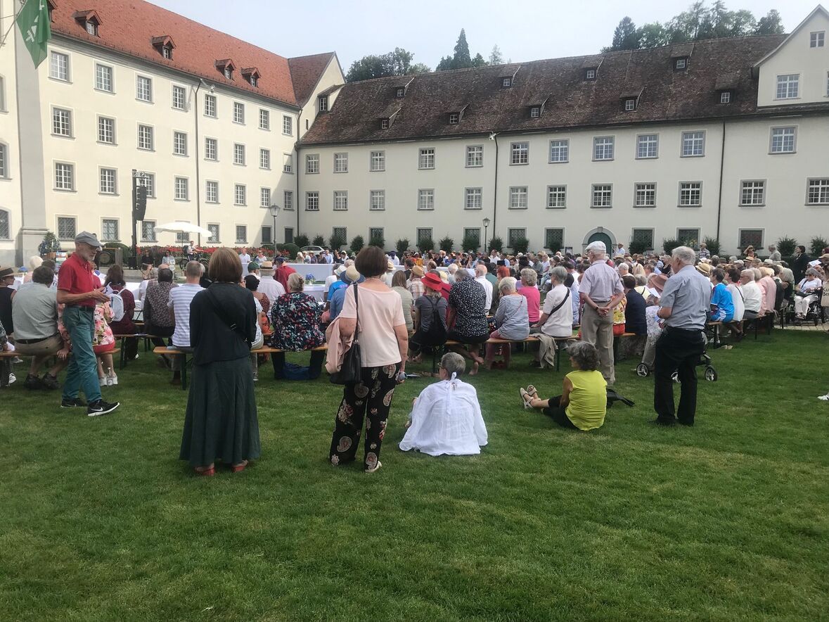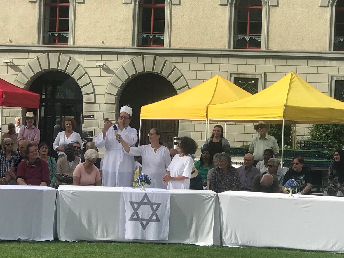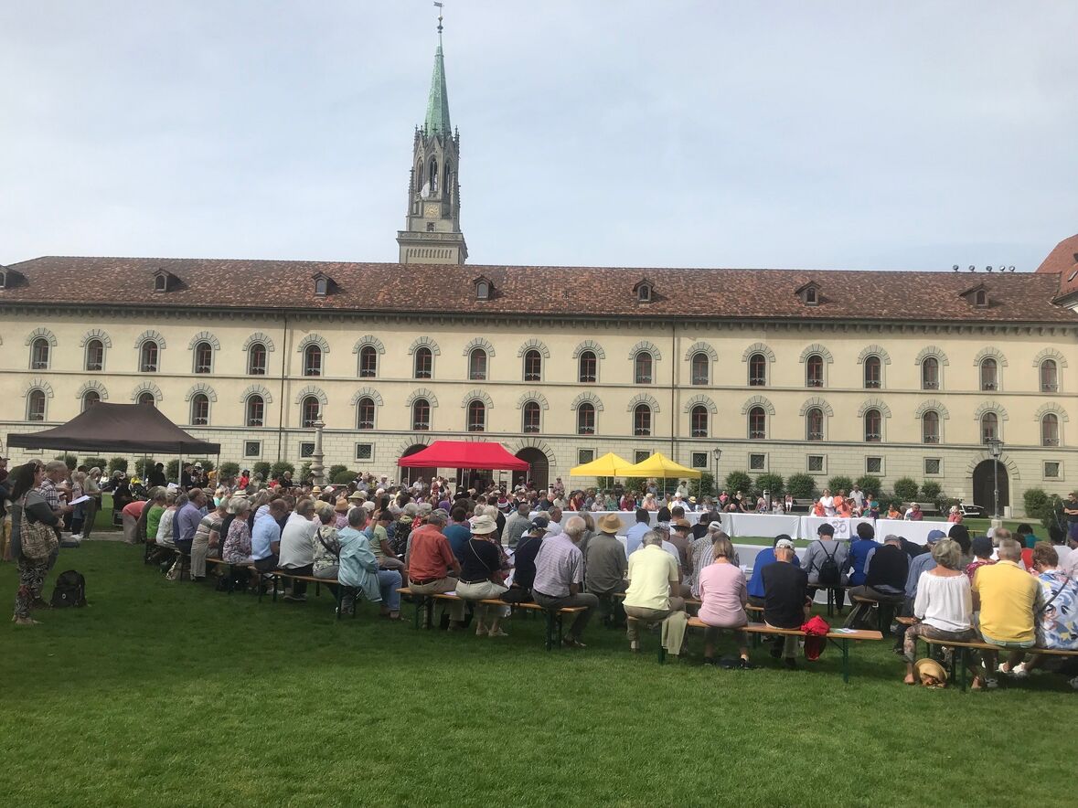 Im strahlenden Sonnenschein, zwischen Kathedrale, St. Laurenzen und Regierungsgebäude, feierten am Sonntag, 17. September 2023 rund 400 Menschen die «Interreligiöse Feier zum Eidgenössischen Dank-, Buss- und Bettag» in St. Gallen. Angehörige aus acht verschiedenen Religionen sangen, rezitierten und beteten um Frieden in der Welt.