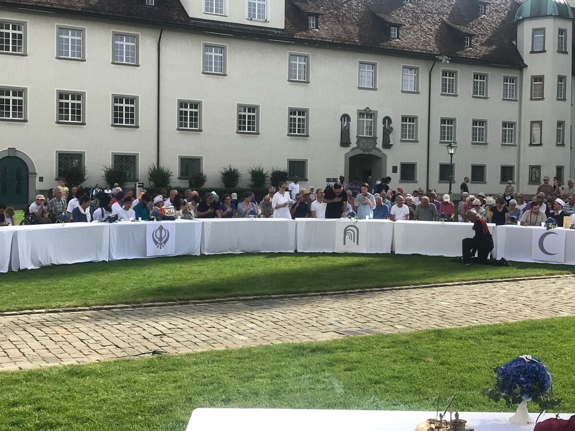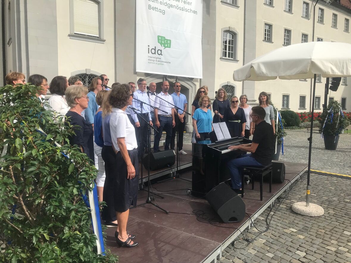 Wie in den letzten Jahren waren acht Tische kreisförmig aufgestellt, an denen Vertreter und Vertreterinnen verschiedener Religionsgemeinschaften in und um St. Gallen Platz nahmen. Im Mittelteil der Feier waren Gebete, Rezitationen und Gesänge aus acht verschiedenen Religionen zu hören und zu erleben. Sie alle baten in ihren jeweils unterschiedlichen Sprachen und Traditionen Gott um Frieden unter den Menschen in der Schweiz. Musikalisch wurde die Feier vom Chor «The Tunes» unter der Leitung von Philippe Frey gestaltet.