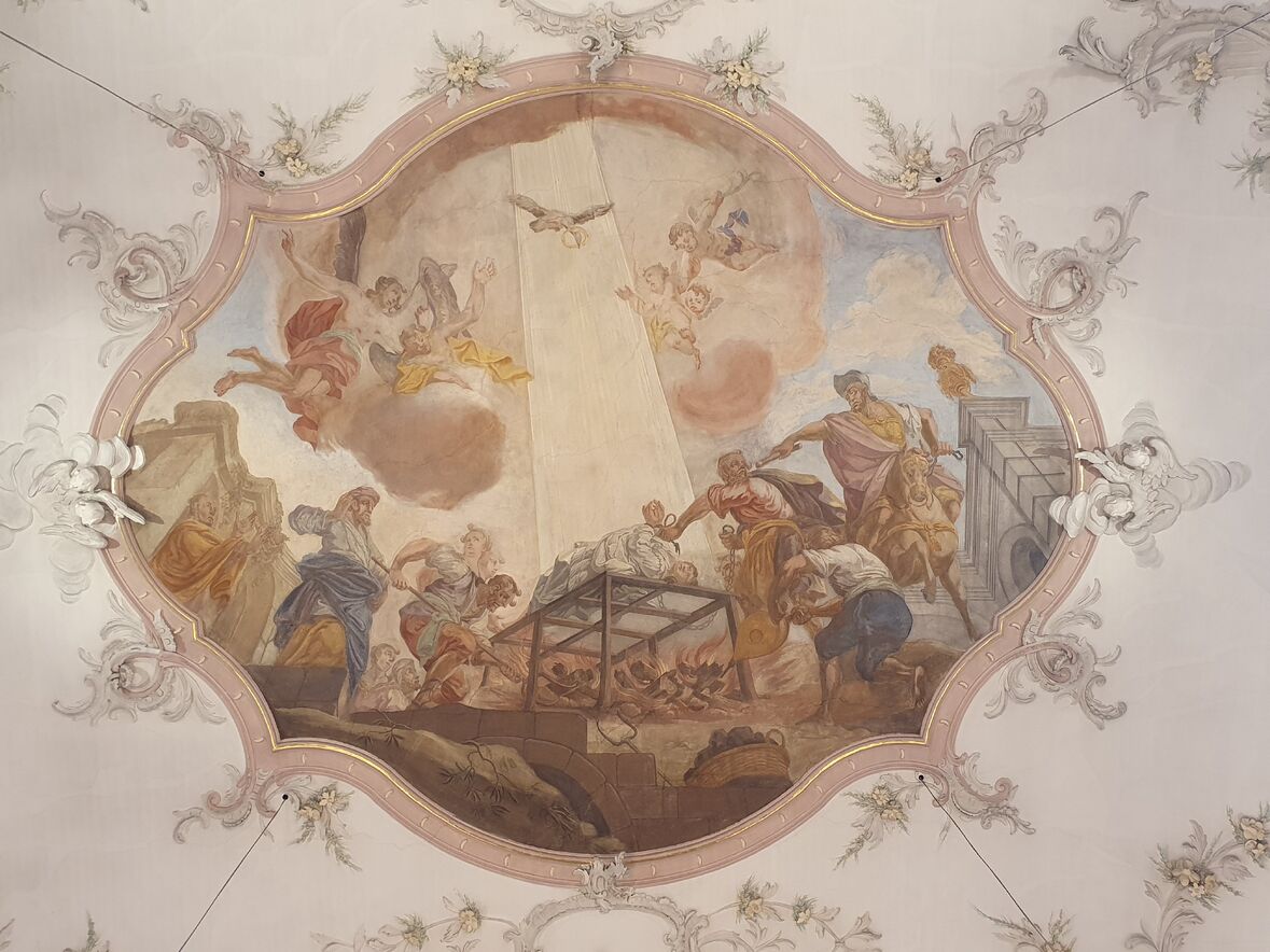 Eines der schönen Deckenbilder: Die hl. Fides auf den Rost gebunden.