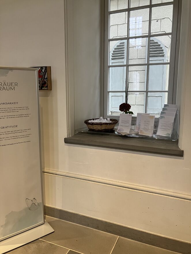Viele nutzten die Gelegenheit auch, die Schutzengelkapelle, die sonst ja nicht geöffnet ist, als Raum der Stille und Einkehr zu geniessen. "Es tut gut, einen Raum für die individuelle Trauer zur Verfügung zu haben", haben uns etliche Personen zurückgemeldet. Viele Zeichen der Dankbarkeit für diese Möglichkeit gingen bei uns ein, was uns dazu ermutigt, auch im 2024 wieder einen TrauerRaum anzubieten.