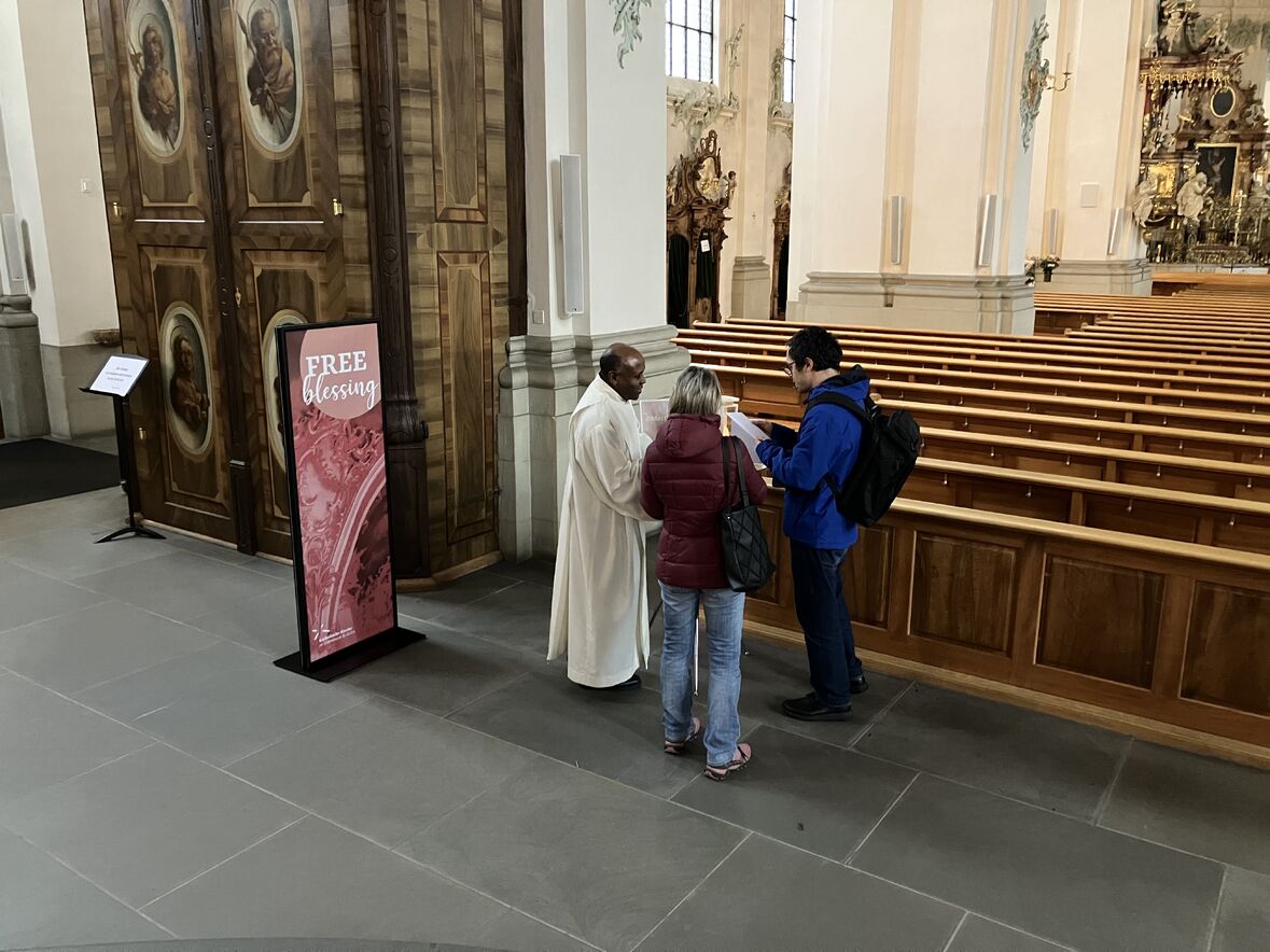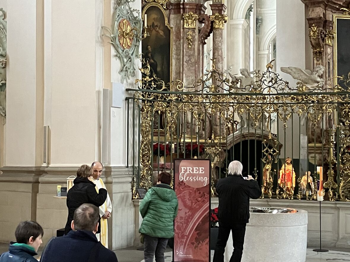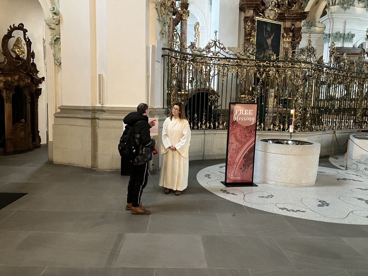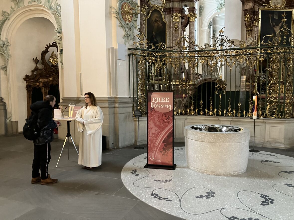 Seit Dienstag, 19. Dezember, sind mit Ausnahme der Feiertage bis zum 30. Dezember jeweils von 14 Uhr bis 17 Uhr Seelsorgende in der Kathedrale anwesend, um Menschen, die es wünschen, zu segnen. Dabei können Interessierte um Segen für ein besonderes Anliegen bitten oder aber sich einfach segnen lassen. In den neun Tagen, in denen wir Free Blessing angeboten haben, konnten wir rund 500 Menschen Gottes wohltuenden Segen weitergeben - Kindern, Erwachsenen, Senior:innen; Menschen aus verschiedenen Ländern; es wurde dabei gelacht und geweint. Segen berührt - das durften wir Seelsorgenden einmal mehr erfahren!