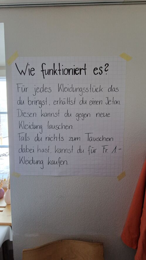 Zum ersten Kleider Tausch im Offenen Haus eingeladen hat Nina Tanner, Praktikantin der Sozialdienste. Zusammen mit verschiedenen Helferinnen aus ihrem Freundeskreis organisierte sie diesen einmaligen Anlass, der von zahlreichen begeisterten Kundinnen und Kunden besucht wurde. Für die hungrigen Gäste standen Gebäck und Getränke bereit. Eine der vielen Kundinnen war zufällig auf diesen Kleidertausch gestossen; sie schwärmte vor dem Offenen Haus: «Ein solcher Kleidertausch sollte unbedingt wiederholt werden»!
