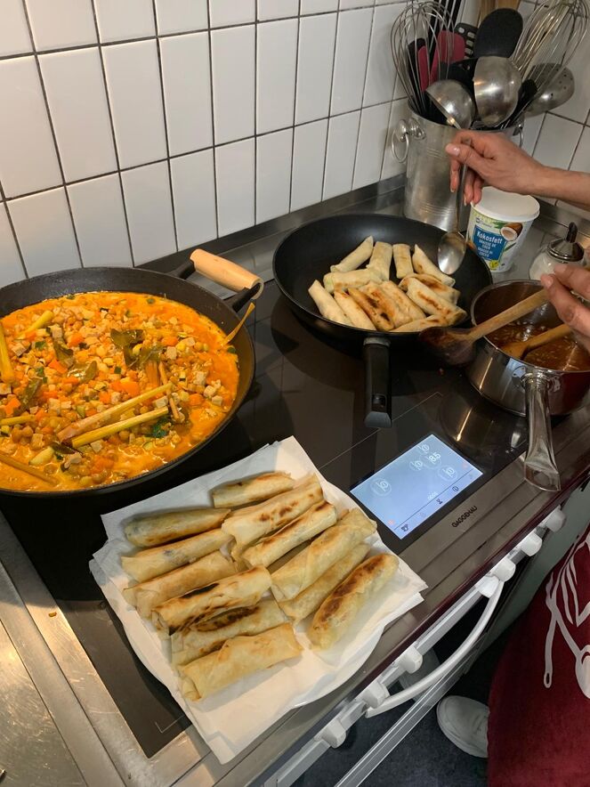 Die Vorbereitungen der vielfältigen Speisen begann bereits Tage davor. Von zwei interessierten Helferinnen wurde unter der Anleitung der kambodschanischen Köchin S. an die 100 Frühlingsrollen gerollt. Mit der Zeit wurde das Küchenteam von zwei bis drei weiteren kambodschanischen Freundinnen ergänzt. Die Zubereitung der Speisen lief auf Hochtouren, dies allerdingst in einer gelassenen Atmosphäre. Köchin S. liess sich trotz rasender Zeit nicht aus der Ruhe bringen.