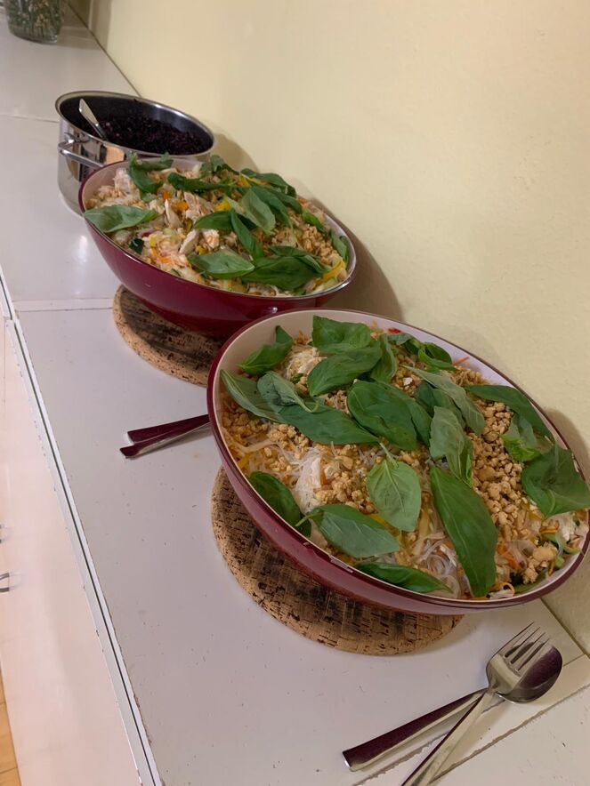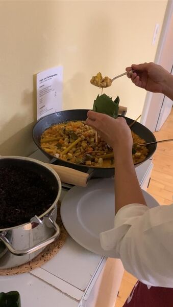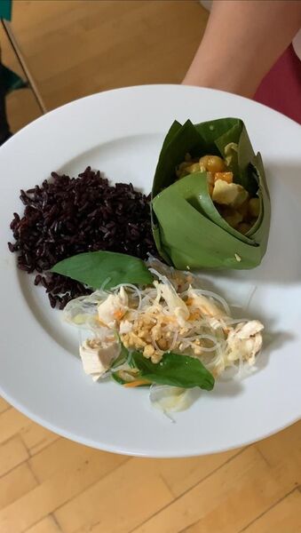 Beim Hauptgang verzauberte sie die Gäste mit einem veganen Kichererbsen Curry mit schwarzem Reis, dass uns von ihr in Bananenblätter serviert wurde. Auch ein kambodschanischer Glasnudelsalat mit Poulet wurde von einer ihrer Freundinnen beigesteuert. Zu allen Speisen wurde uns von S. etwas zum kulturellen Hintergrund und erzählt und gezeigt, auf welche Art die Gänge in Kambodscha gegessen werden.