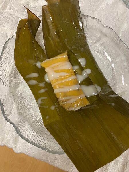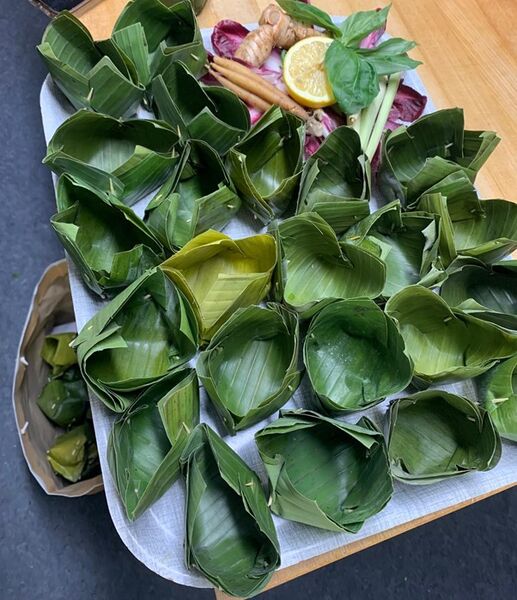 Der Abschluss des 3-Gang Menüs machten in Bananenblätter gewickelte und gedämpfte Kürbiskuchen an einer süssen Kokossauce. Zusätzlich verwöhnte sie die Gäste mit einem Apfelkuchen, zubereitet aus Kokosmehl.