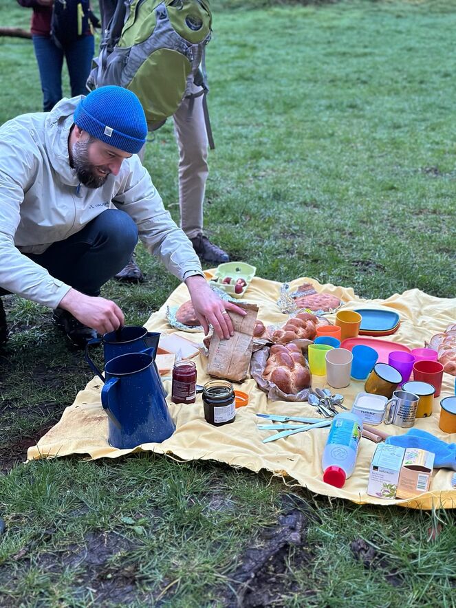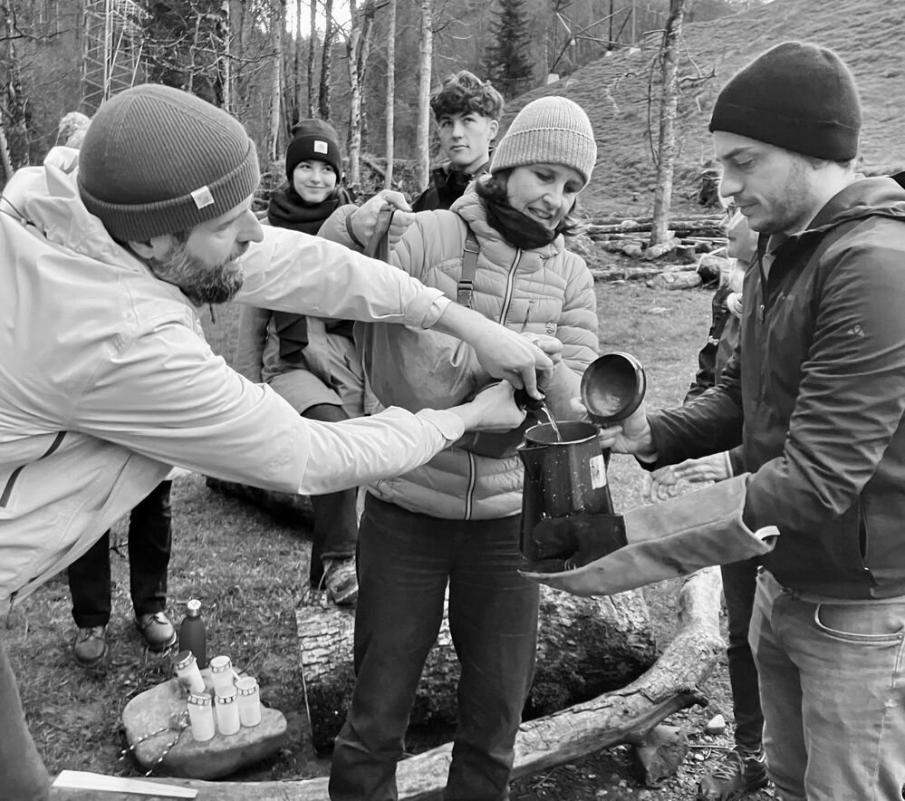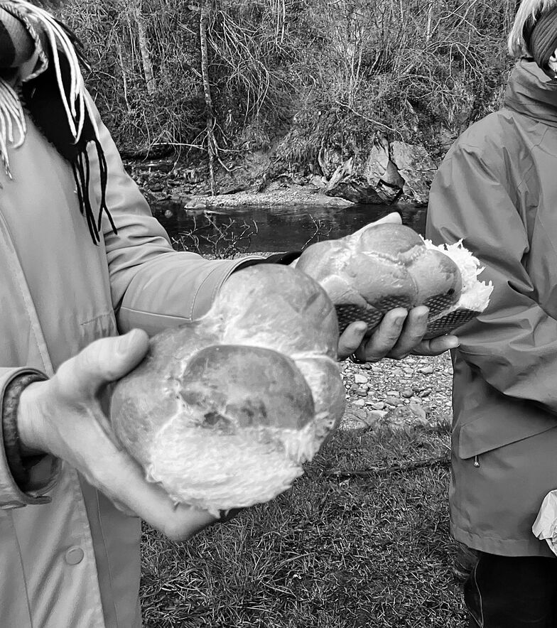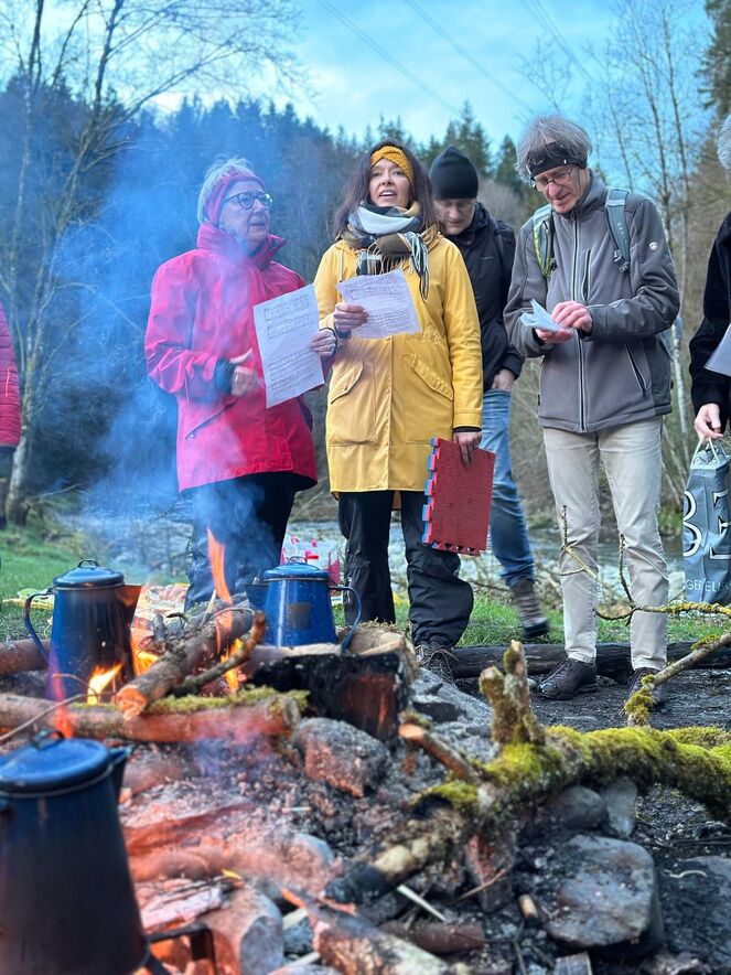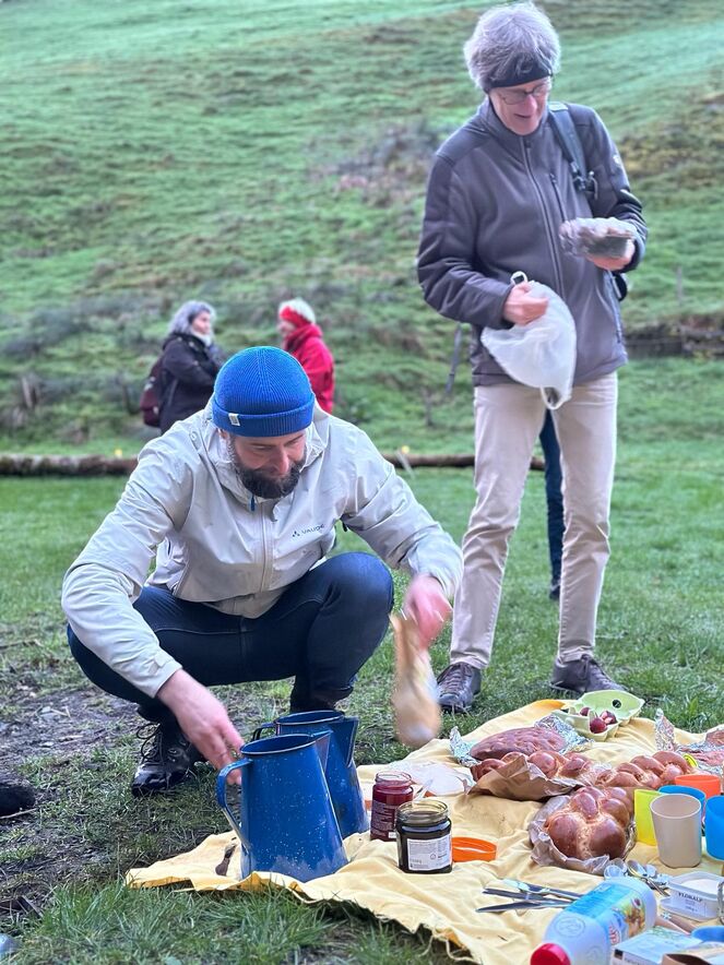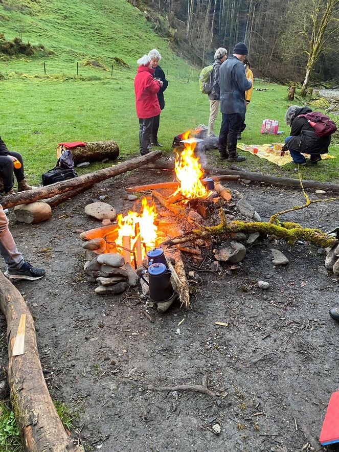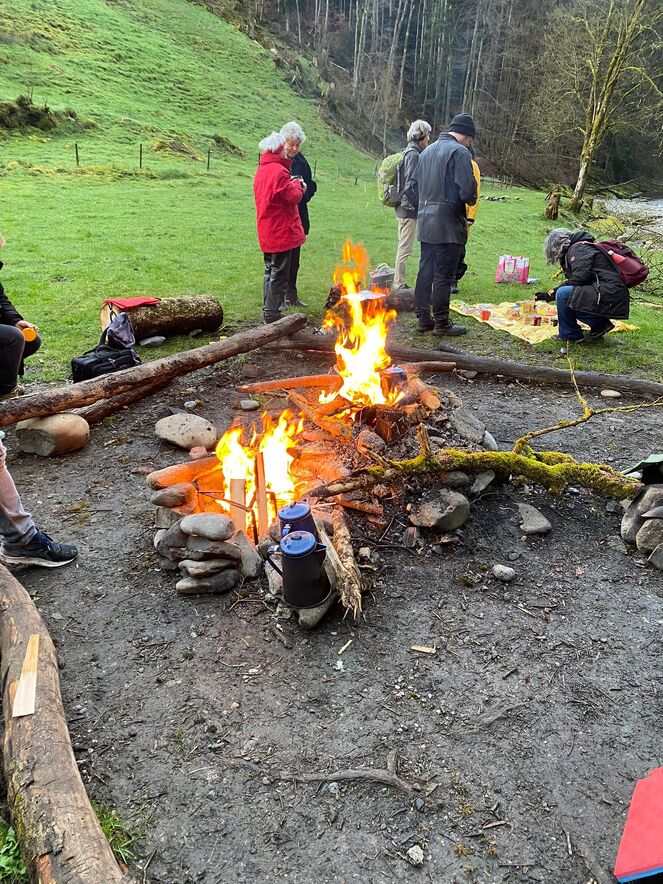 An der Sitter angelangt, wurde ein Feuer entfacht und so wie der Auferstandene Jesus mit den verblüfften Jüngern (Joh 21,1-14) damals am See von Tiberias das Morgenmahl gehalten - allerdings ohne Fische aber dafür mit Brotbrechen, Käse, Konfi und Colomba. Von der rauschenden Sitter liessen sich die Teilnehmenden dann ihr Ostergeheimnis erzählen und von dort aus starteten alle dann wieder in ihren je eigenen Ostertag.