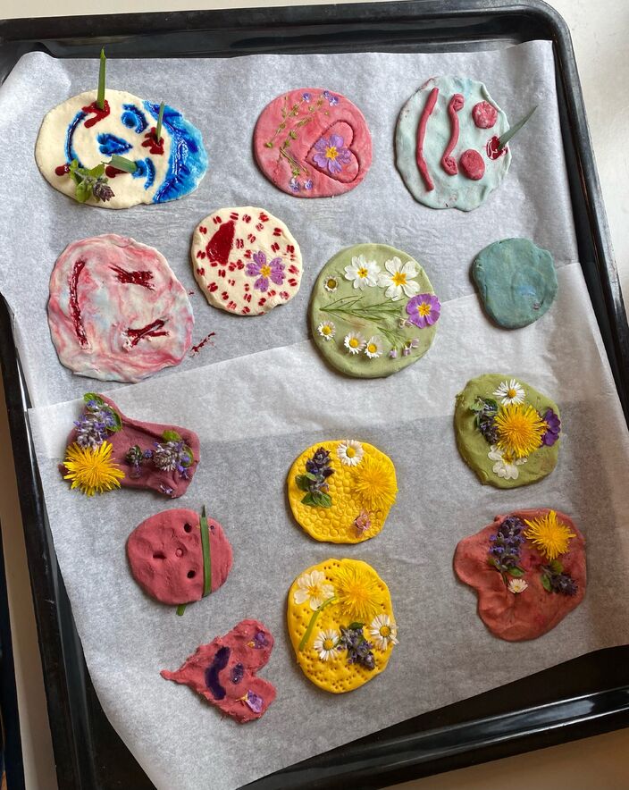 Heute Morgen haben wir Salzteig gemacht und mit selbst gepflückten Blumen verziert.