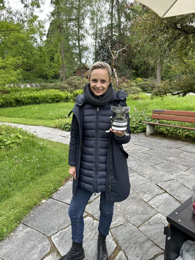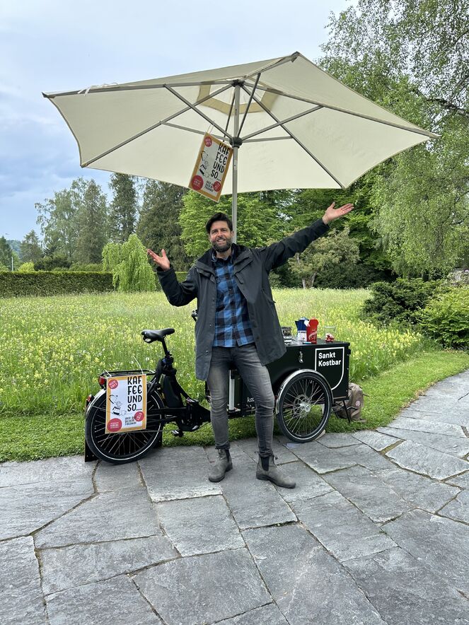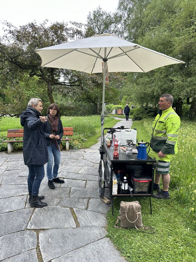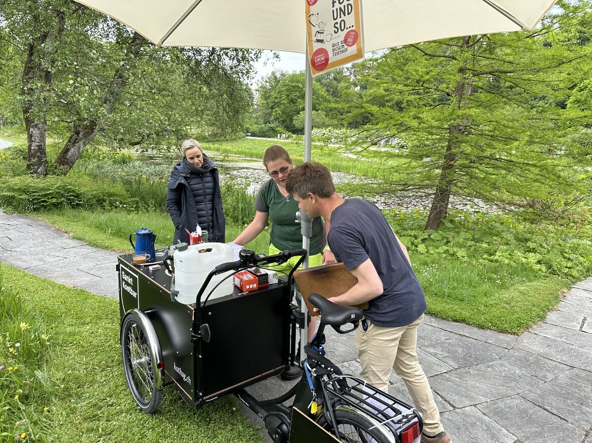 Bei gutem - d.h. trockenem - Wetter waren Pfarrerin Andreas Weinhold und Mobiler Cityseelsorger Matthias Wenk heute mit der "Sankt Kostbar" auf dem Ostfriedhof präsent. An der "Sankt Kostbar" soll's Tee, Kaffee und Schoki geben - und natürlich die Möglichkeit für Gespräche. Beim nächsten Einsatz wird der Bezinkocher für den Bialetti-Espressokocher dann hoffentlich auch funktionieren...