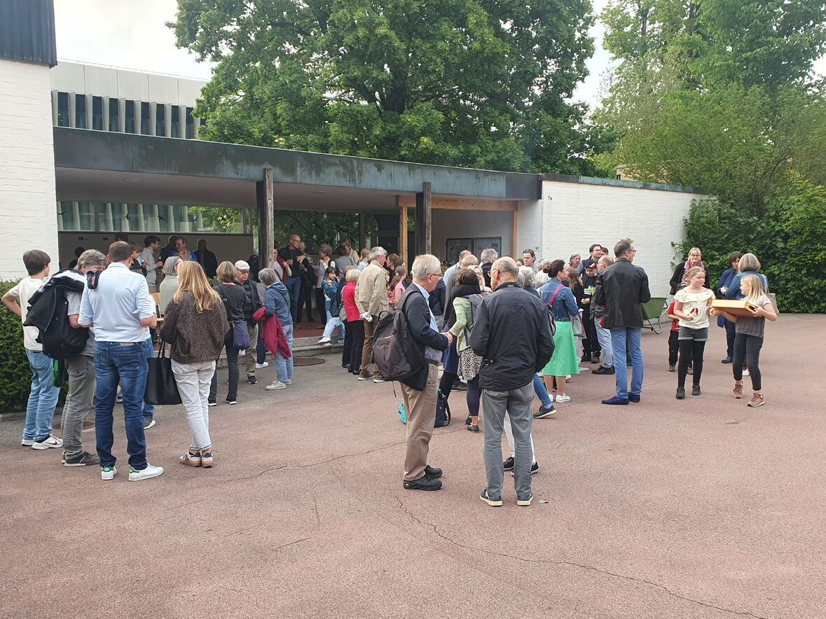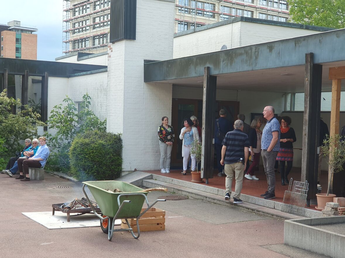 Diesmal nicht neben der Kirche, dafür im Pfarreiheim. Der Gottesdienst enthielt Elemente für alle Altersklassen. Der Kern war, jemandem den Pfingstsegen zu wünschen, das auf ein Blatt Papier zu schreiben, um ein Holzstück zu binden, und damit das Feuer vor dem Haus zu nähren.