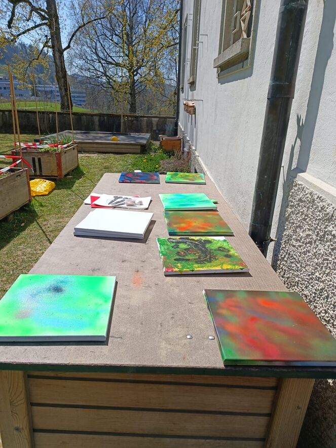 Am Nachmittag ging es dann weiter mit einem weiteren Highlight: dem Spraydosen-Malen auf Leinwänden. Mit Schutzkleidung ausgestattet, sprühten die Kinder kräftig auf die Leinwände und kreierten beeindruckende Kunstwerke. Dabei konnten sie verschiedene Farben und Sprühtechniken ausprobieren und ihre Kreativität in vollen Zügen ausleben.