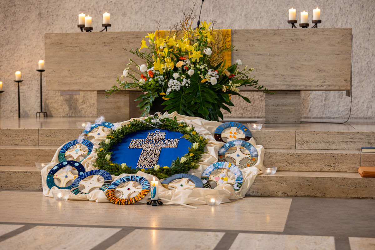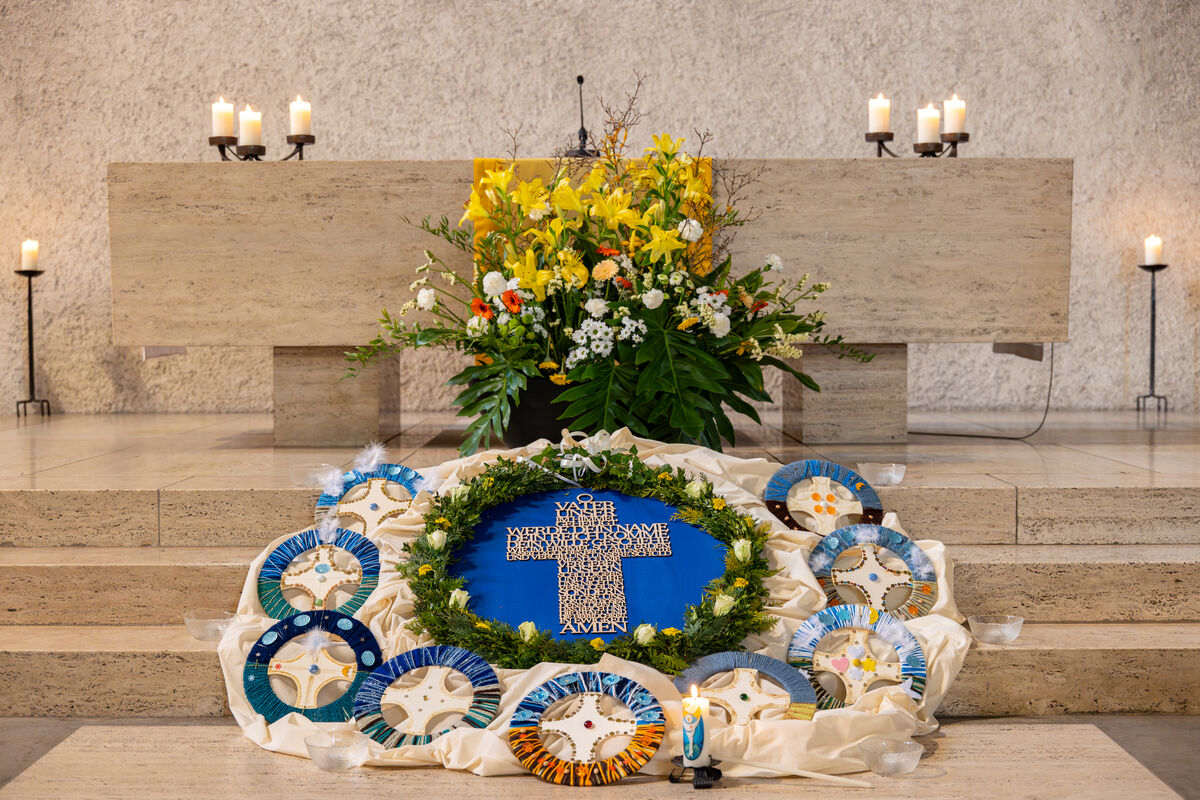 Das gestaltete Ringbild mit Kreuz zeigte: Jesus verbindet den Himmel mit der Erde.