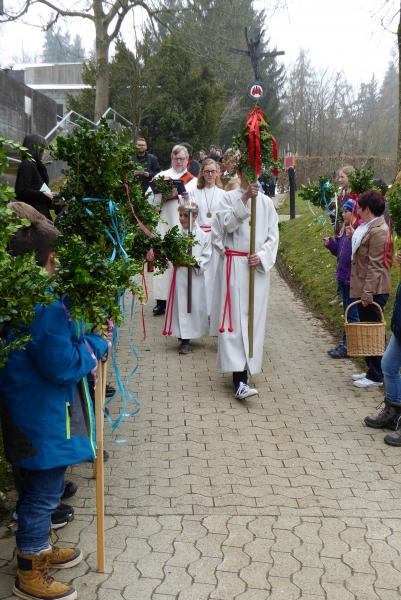 Eucharistiefeier mit Palmkreuzen und Palmwedeln.