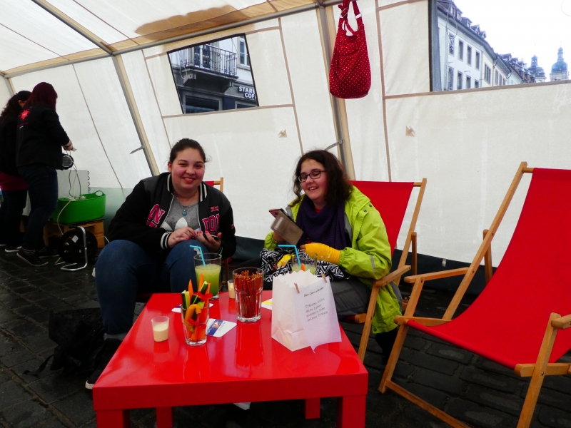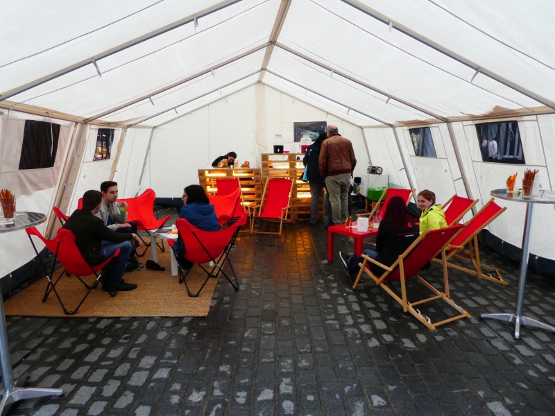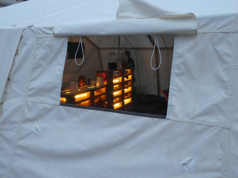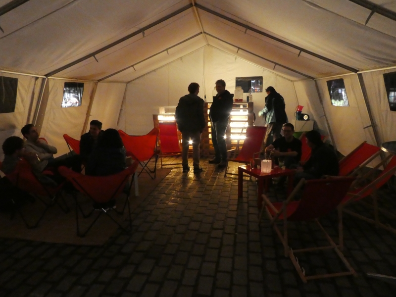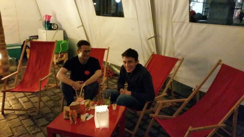 Und in der Tat folgten nicht wenige dieser Einladung. Auch andere blickten neugierig ins Zelt, blieben für eine Weile bei Snacks und Drinks. Manche machten es sich richtig gemütlich und unterhielten sich angeregt. Vielleicht hätten es mehr junge Menschen sein können, aber fürs erste Mal war der Besuch nicht schlecht, war doch die eigentliche Betriebszeit ziemlich kurz, da wir um 23.00 Uhr schon wieder alles geräumt haben mussten. Und es zeigte sich, dass wir mit diesem Projekt durchaus junge Menschen erreichen können.