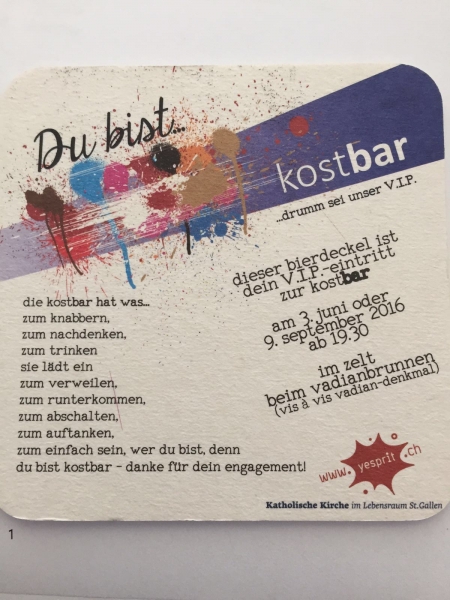 „Du bist kostbar... Sei du selbst!“ Bierdeckel mit solchen und ähnlichen Aufdrucken fanden sich neben alkoholfreien Drinks und Snacks in der kostBar. Sie sollten bei stilvollem Ambiente zum Denken und Sprechen über Gott und die Welt anregen. Als Wertschätzung für die kostbare Freiwilligenarbeit, welche Jugendliche in den verschiedenen Jugendverbänden wie Pfadi, Jungwacht, Blauring und den Ministranten leisten, erhielten sie eine V.I.P. Einladung und einen Gutschein für ein Gratisgetränk. Wir wollten den jungen Menschen damit sagen: „Du bist kostbar. Dein Engagement ist es auch“.