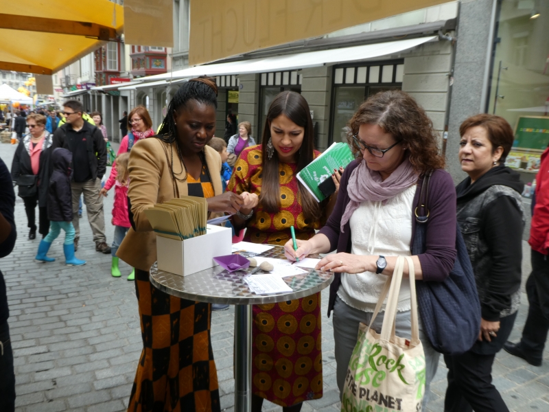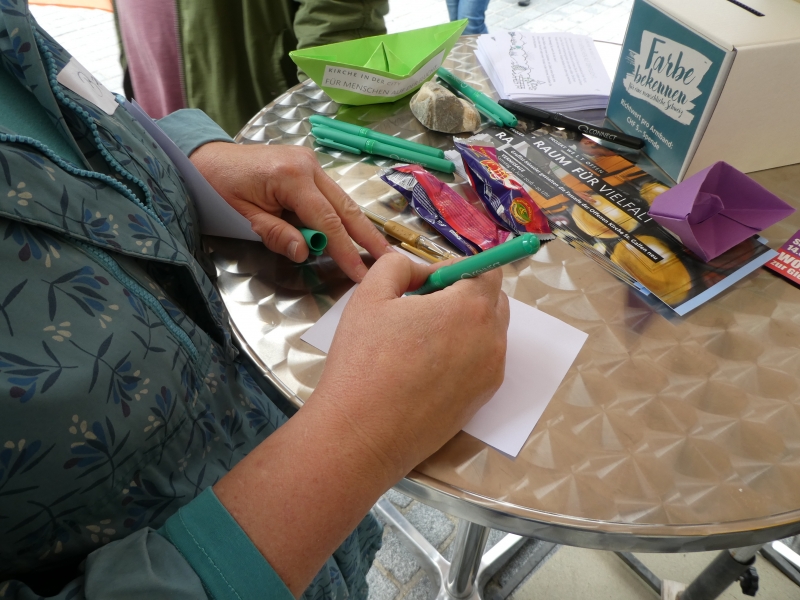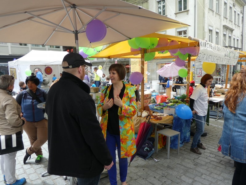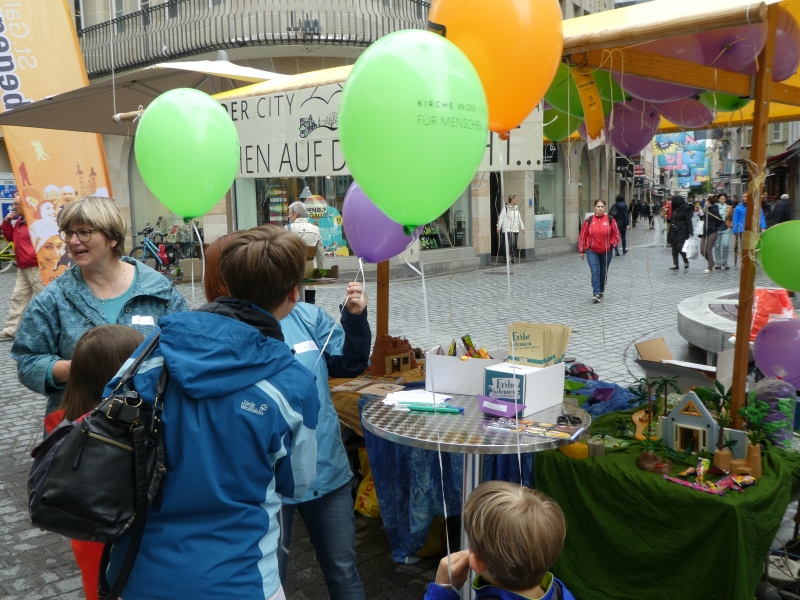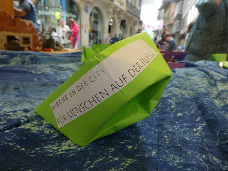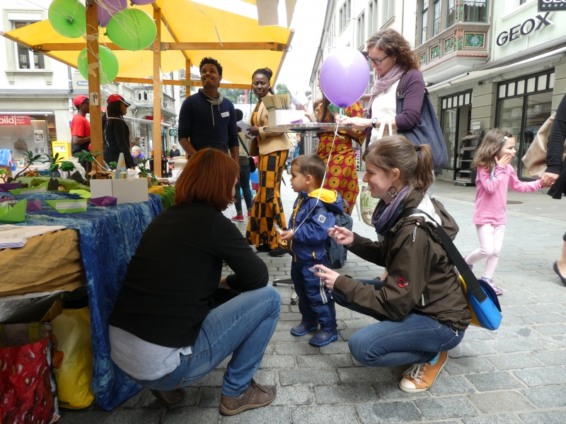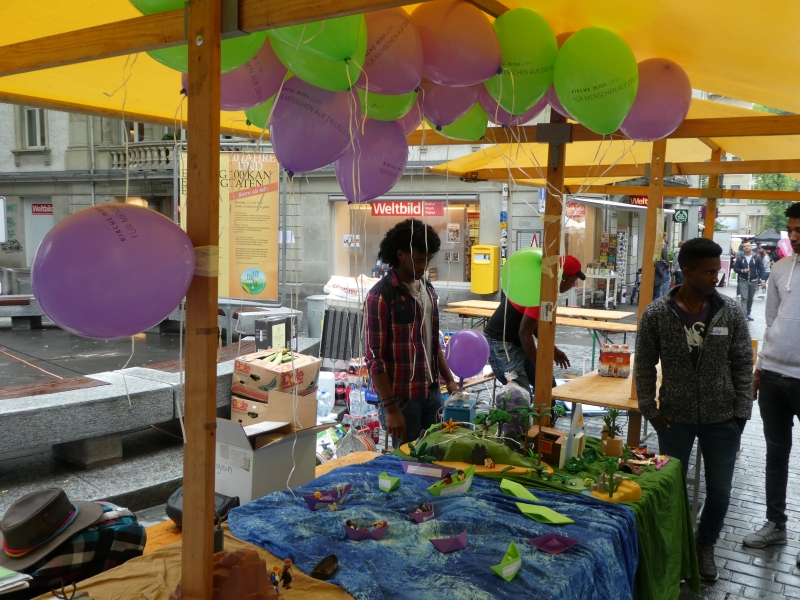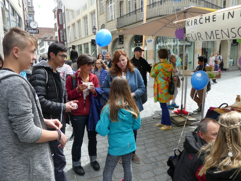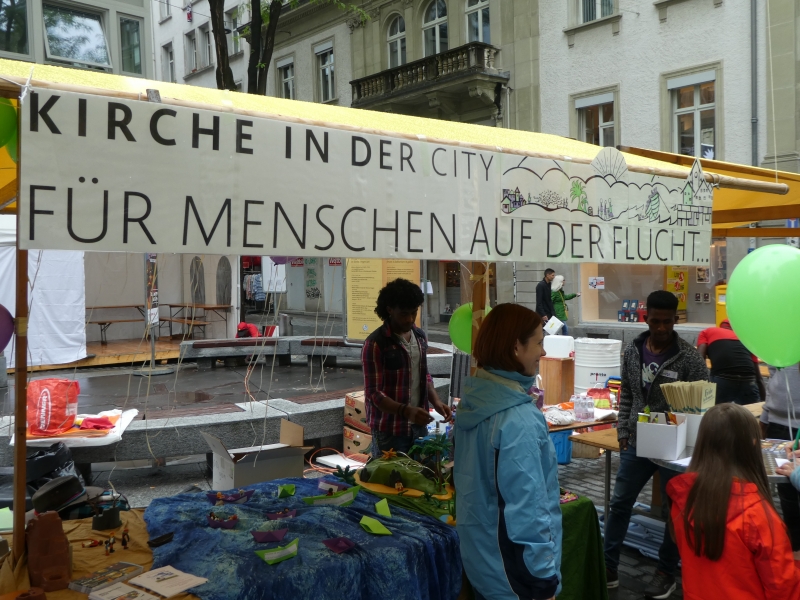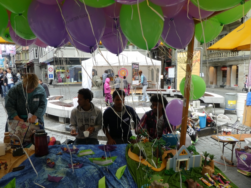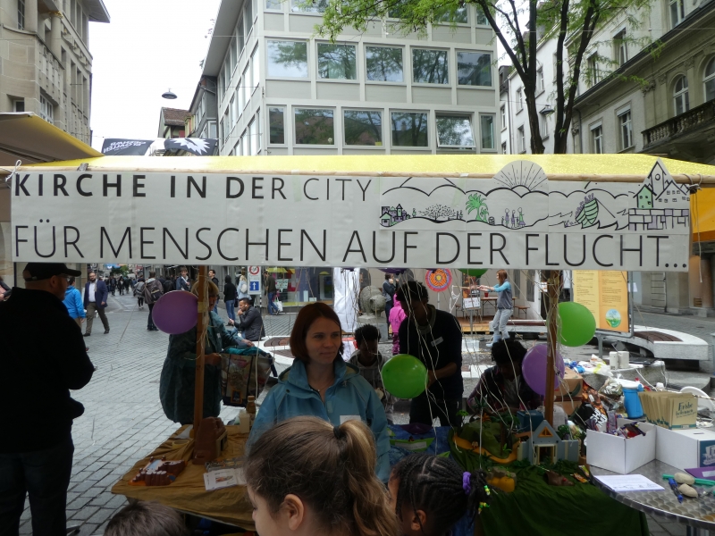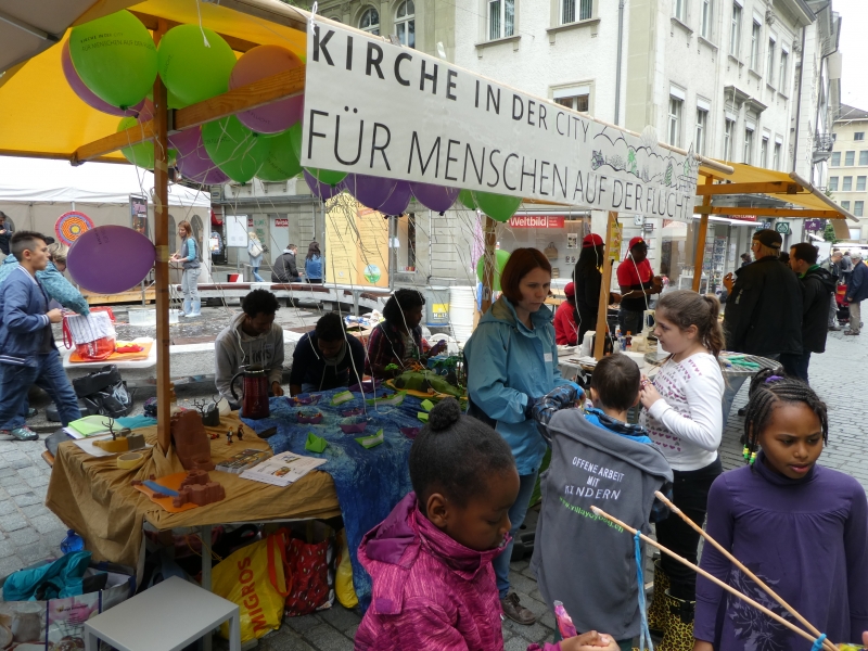 Dieser Slogan von Kirche in der city hat viele Passanten in der St. Galler Innenstadt dazu bewegt, sich mit dem Thema Flüchtlinge auseinanderzusetzen. Um damit ein Zeichen zu setzen, liesen Gross und Klein einen Ballon, der einen Gedanken, ein Gebet, einen Dank, eine Bitte, einen Wunsch oder einen Vorsatz in den Himmel steigen. Selbst ein Team von jungen Flüchtlingen aus Eritrea wirkten am Stand von Kirche in der city.