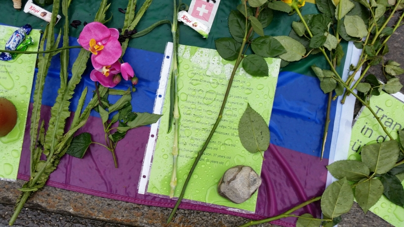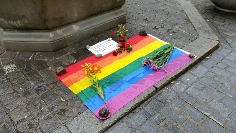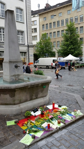 Wir laden ein, eine Blume, ein Strauss, eine gedeckte Kerze oder ein anderes Symbol zur Regenbogen-Fahne zu stellen, die wir in der Marktgasse vor den Brunnen vor dem Starbucks gelegt haben: