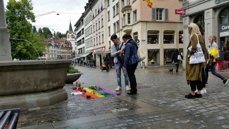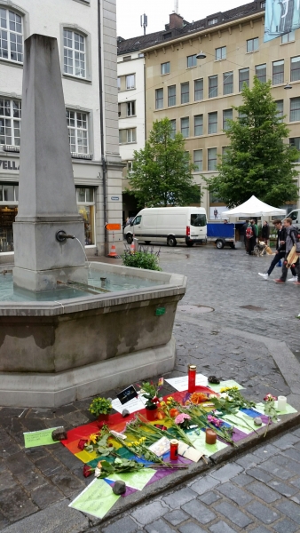 Vom 13. – 19. Juni gedenken viele Menschen am Ort der Anteilnahme in der Marktgasse den Opfern. «Wir wollen uns daran nicht gewöhnen! Wir werden uns daran nicht gewöhnen!» 50 Tote in einem Schwulen-Club in Orlando / Florida!