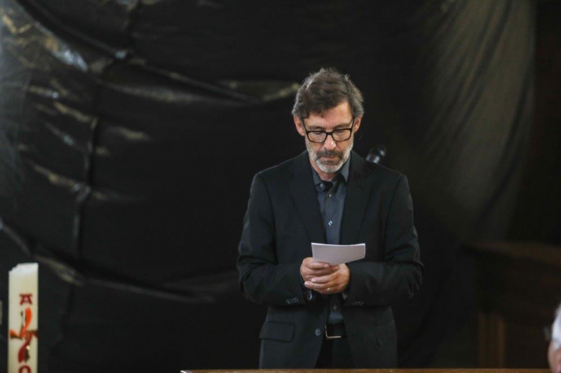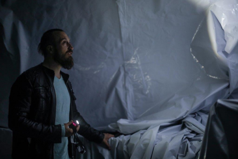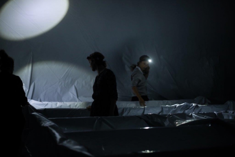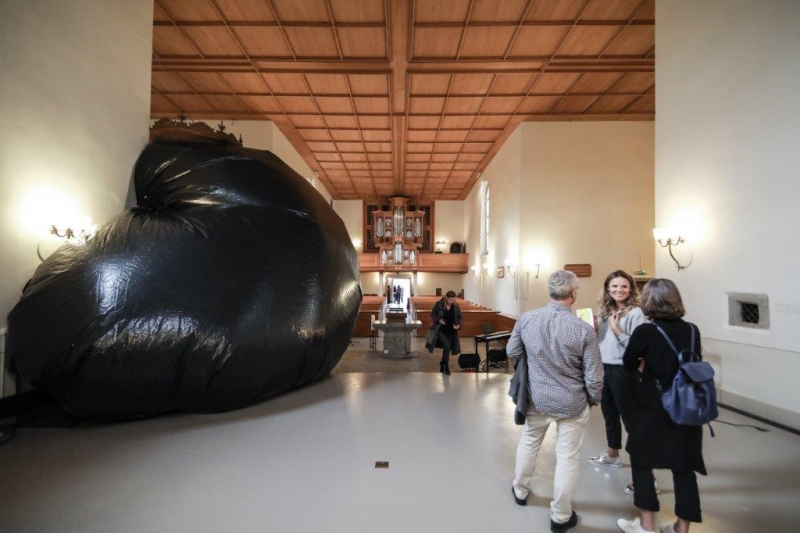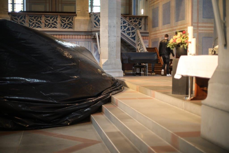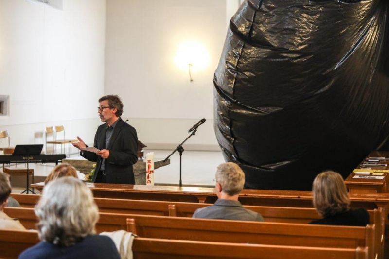 Der kleine Dome wird in die Kirche getragen und im Chorbereich flach auf dem Boden ausgelegt. Er besteht aus schwarz glänzender Silofolie, wie sie in der Landwirtschaft eingesetzt wird. Sie wirkt kalt und fremd im nüchternen Kirchenraum. Der Dome ist ein fixfertiges Objekt, das über ein Gebläse mit Luft gefüllt wird. Das dauert rund 15 Minuten. Dafür muss ein Kanal aus Folie gebaut werden.