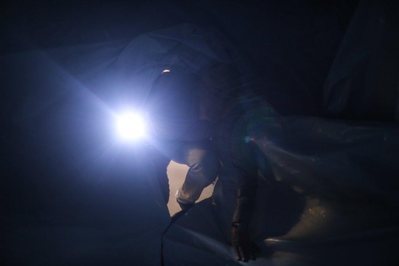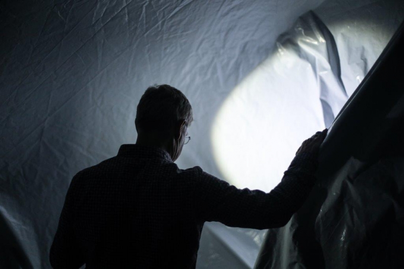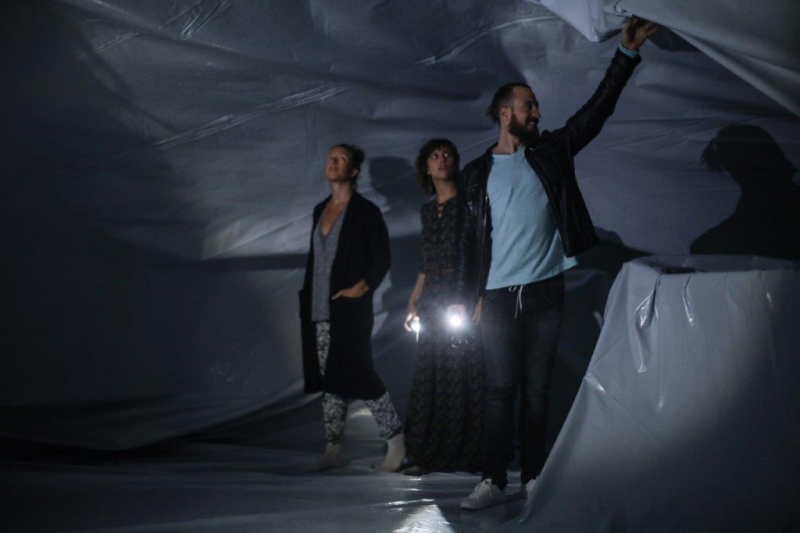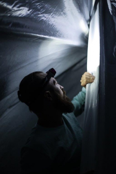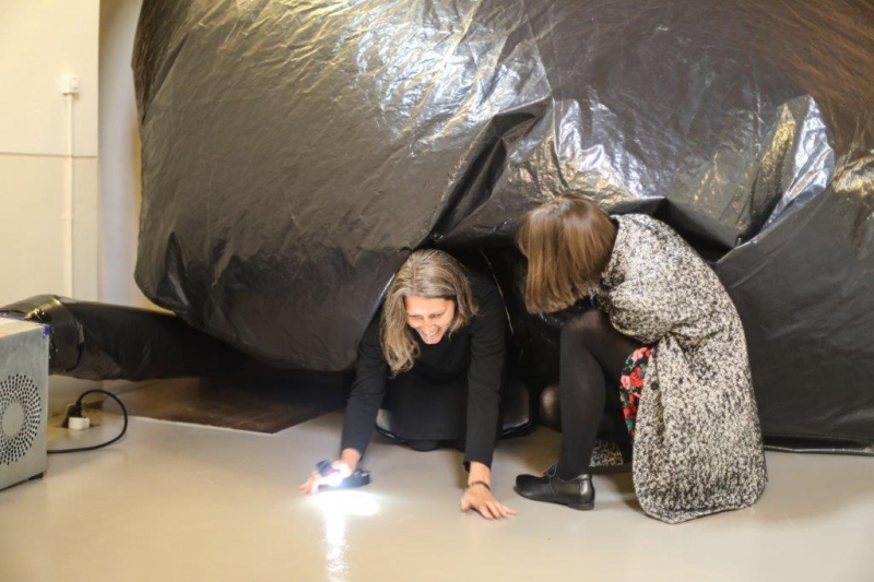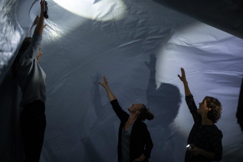 Nun darf man den kleinen Dome ausgerüstet mit einer Stirnlampe betreten. Der Einstieg ist mit einem Klettverschluss versehen. Er befindet sich unten am Objekt, so dass man sich bücken muss: «Man kann nicht loslaufen, sondern muss bewusst eintreten», sagt Katharina Mayrhofer. Im Innern ist der Dome weiss. Es ist eine andere Welt, die man vorsichtig und mit geschärfter Wahrnehmung erkundet. Verschiedene Assoziationen tauchen auf: Tropfsteinhöhle, Muschelgehäuse, gotische Kathedrale. Durch die Luft wird die Folie an die Architektur gedrückt und so ein Negativabdruck geformt.