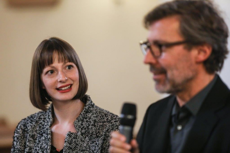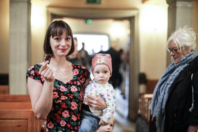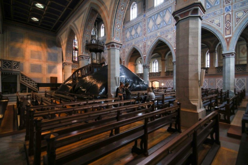 Um 14.45 Uhr ist es geschafft: «Jetzt bin ich sehr zufrieden», sagt Katharina Mayrhofer. Liselotte ist mittlerweile auf ihrem Rücken eingeschlafen. Die hölzerne Kanzel mit ihrer gewundenen Treppe ist fast vollständig unter der schwarzen, nierenförmigen Installation verschwunden.