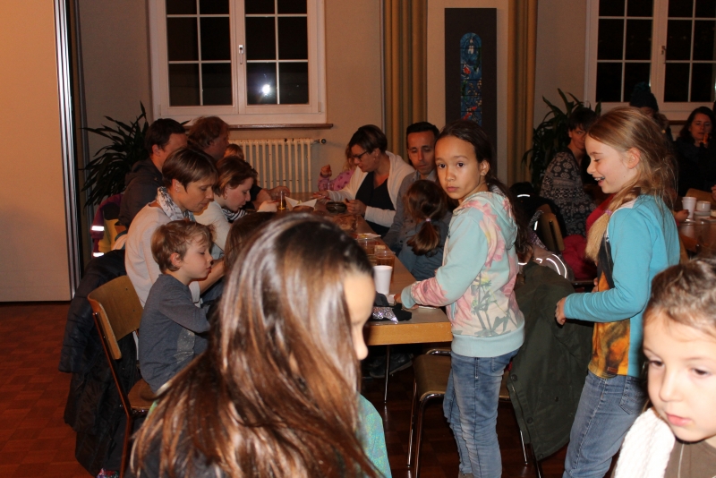 Beim anschliessenden Nachtessen mit Wienerli und Kürbis-Suppe und den verschiedenen Ateliers für Kinder (Lichter basteln, Lagerfeuer, Samariter-Kurs, Märli - und Tanzstunde, Lichterparcours, Kinderschminken) kamen alle Besucherinnen und Besucher auf ihre Kosten.