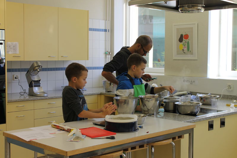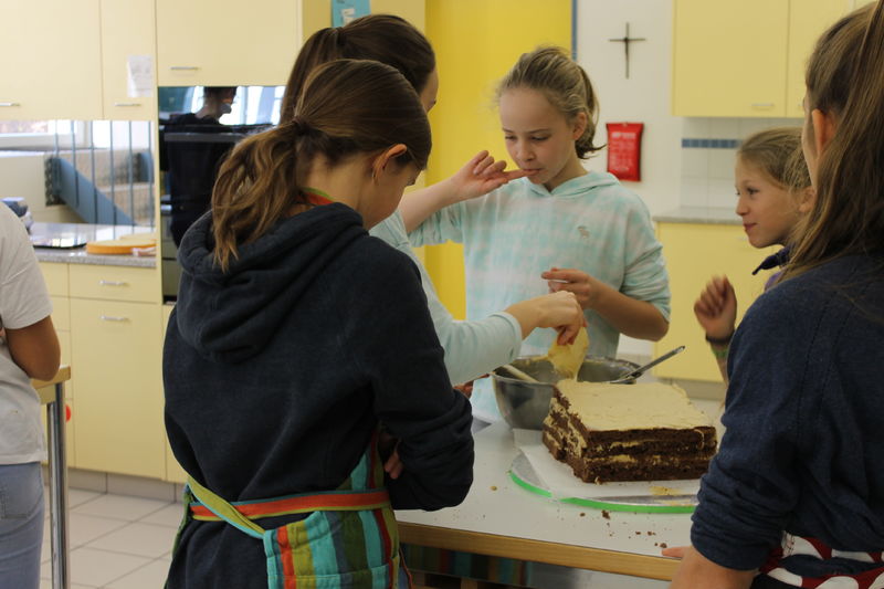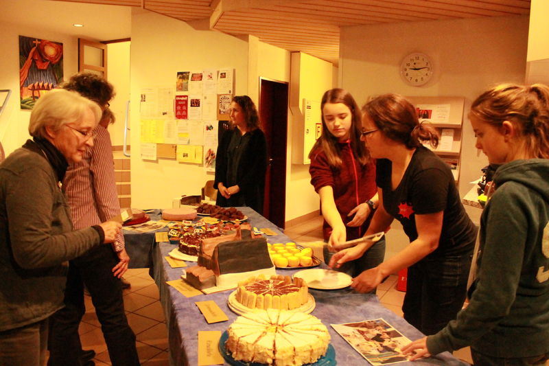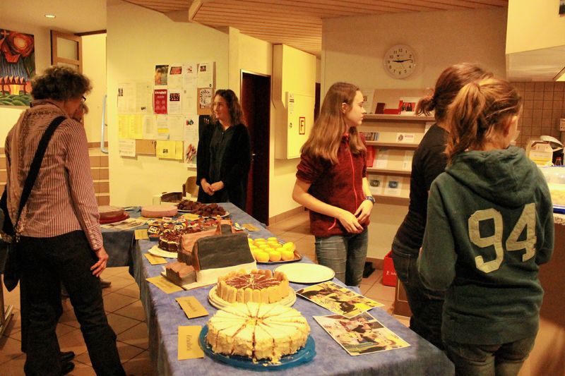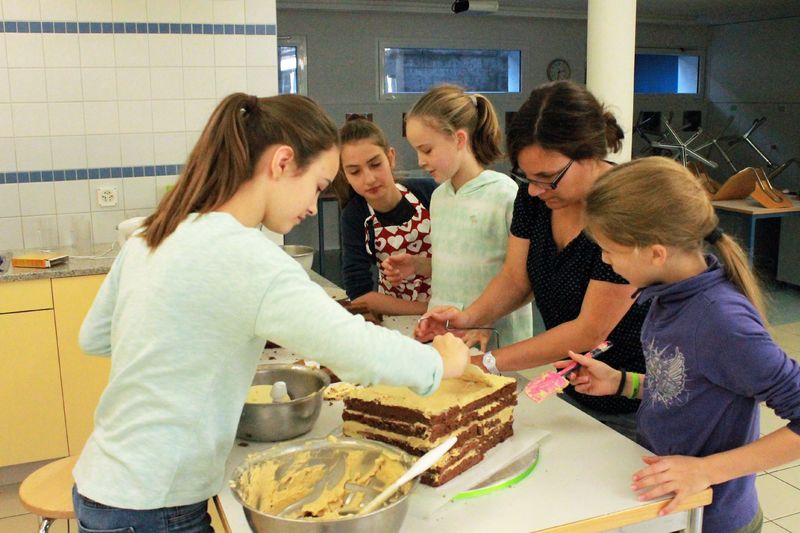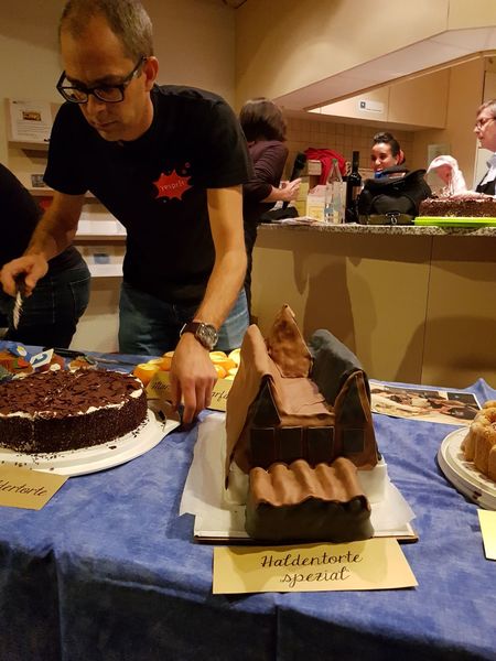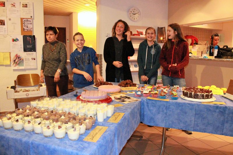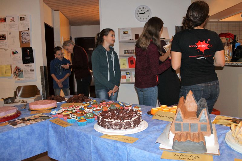 Für eine Tortenschlacht ging es dann doch ziemlich gesittet zu und her in der Schulküche des Notkerschulhauses... Die Herausforderung, für 90 Personen ein Dessertbuffet herzurichten erforderte von den beteiligten Jugendlichen vollen Einsatz. 5 Stunden lang wurde mit viel Freude und Enthusiasmus gerührt, geknetet, gebacken, verziert und natürlich auch probiert. Das Resultat konnte sich mehr als sehen lassen und löste bei den Gästen in der Haldenkirche helle Begeisterung aus. Von den Schwarzwälder- oder Kirschtorten über Tobleronemousse und Limettencreme bis hin zu Cheesecakes und Mandarinenparfait war für jeden Geschmack etwas dabei. Das Schmuckstück des Buffets war eine Motivtorte in Form der Haldenkirche, einfach wow! Ein grosses Lob und ein noch grösseres Dankeschön gilt den Bäckerinnen und Bäckern, die an diesem Mittwochnachmittag alles gegeben haben. Ihr wart spitze!