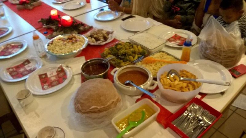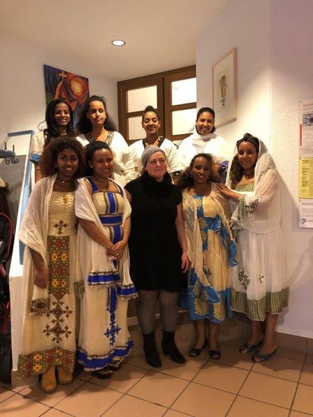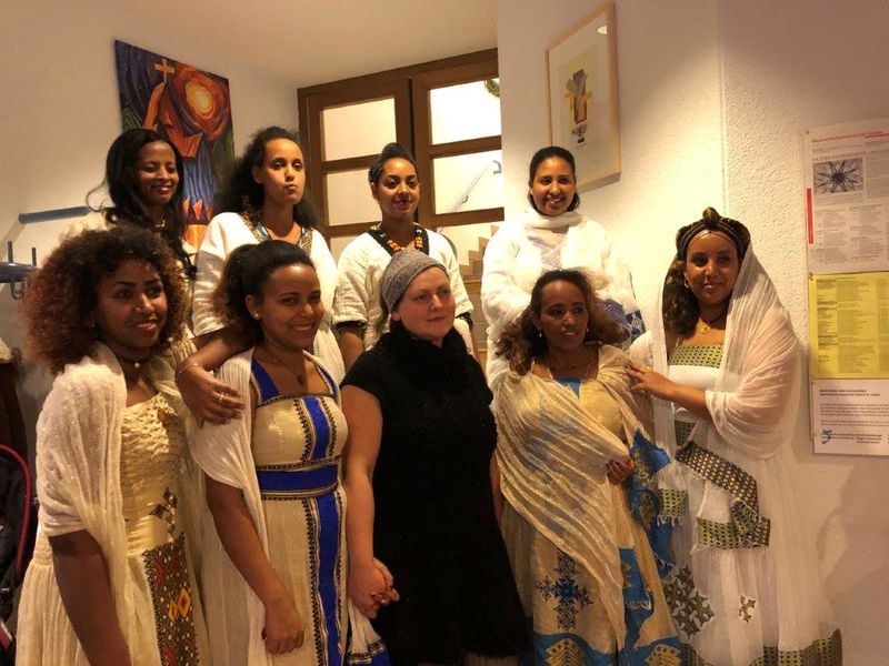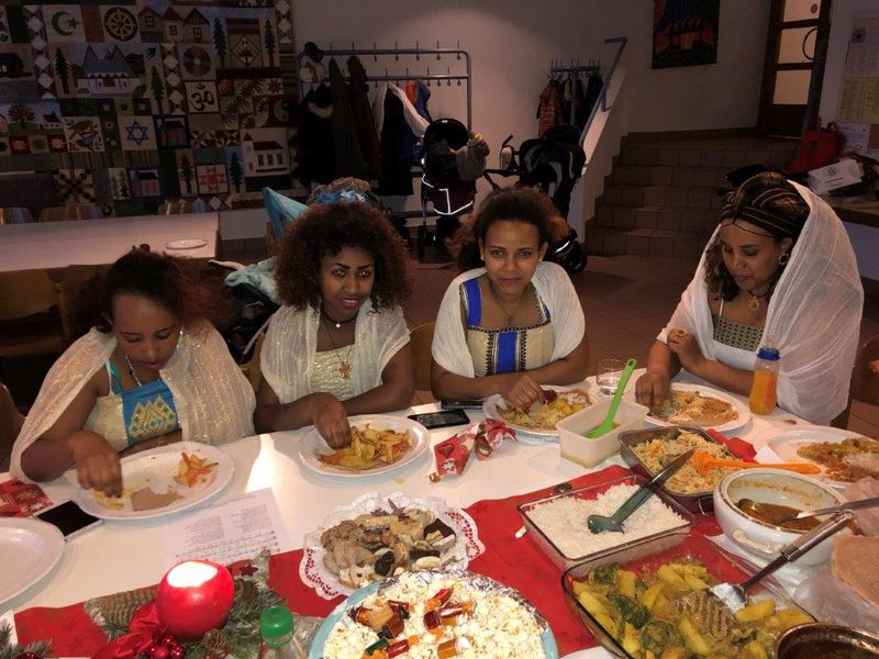 Zur Adventsfeier hatten alle etwas mitgebracht, und so gab es nebenWeihnachtsguetsli auch reichlich eritreische Köstlichkeiten. Das Abendessen konnte danach dann ausfallen. Wir haben zusammen deutsche Weihnachtslieder gesungen, ein eritreisches Michael-Lied (denn nach eritreischem Kalender - ich wußte gar nicht, daß sie einen eigenen anderen haben - war am 21.12. der Tag des Heiligen Michael) und griechische Weihnachtslieder gehört . Es war interessant von verschiedenen Bräuchen zu erfahren. Dazu gehört auch, daß die Eritreärinnen sich nach dem Nähen für die Feier extra noch einmal umzogen und festliche weiße Kleider anlegten.