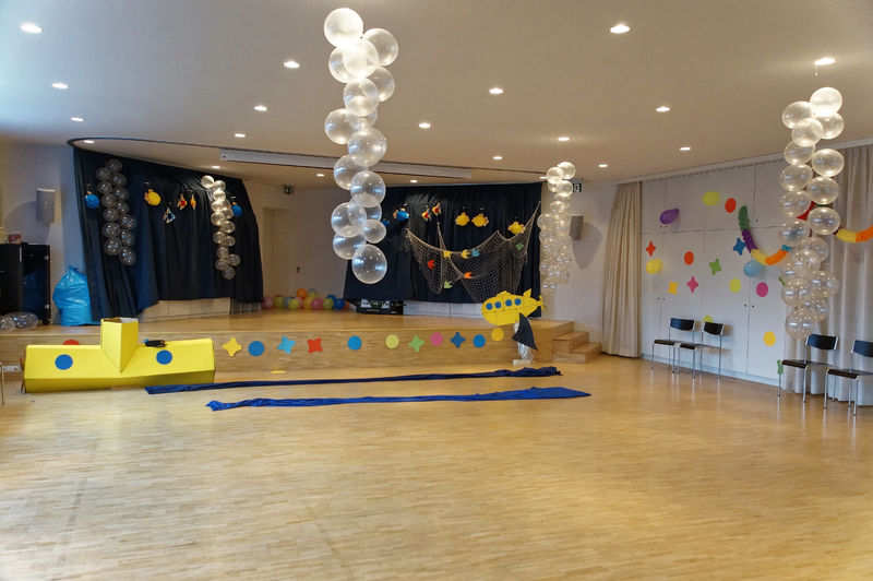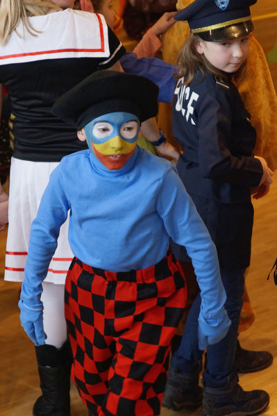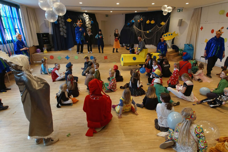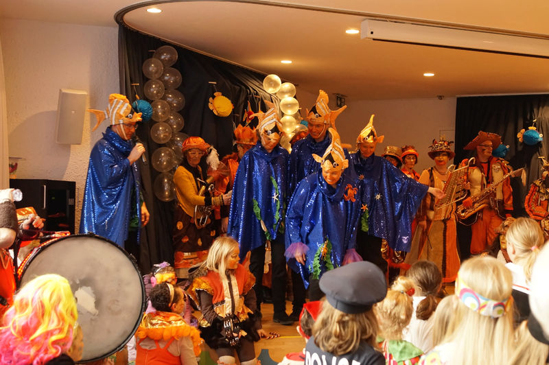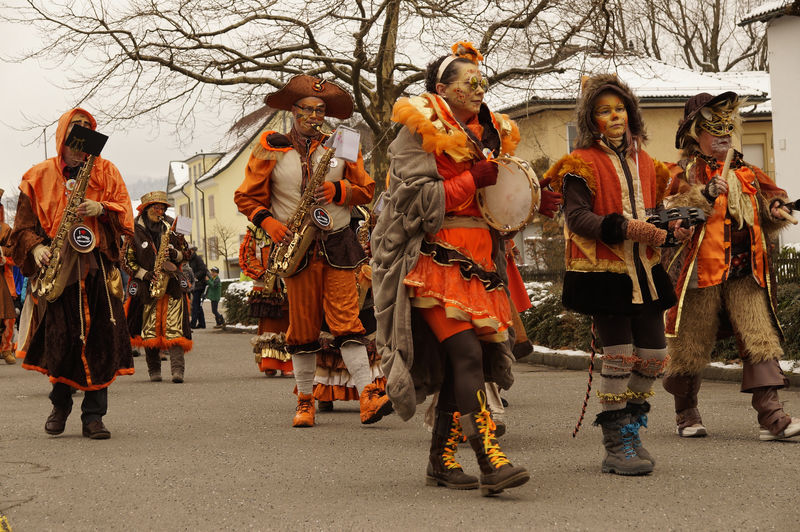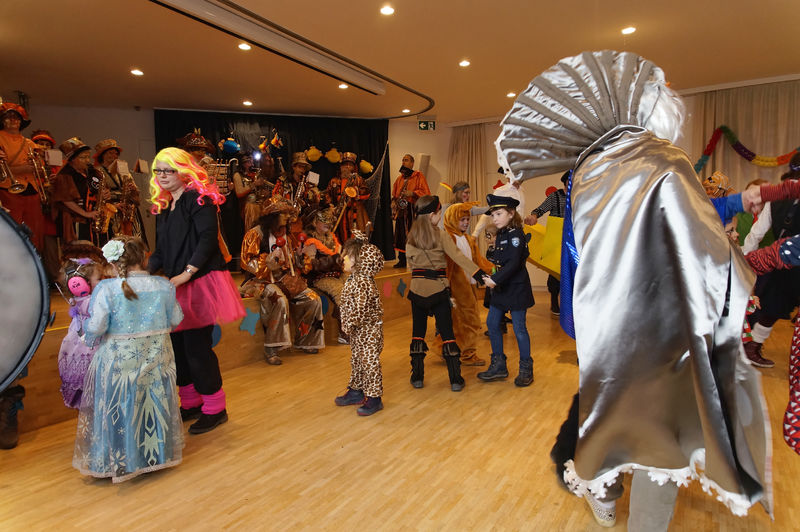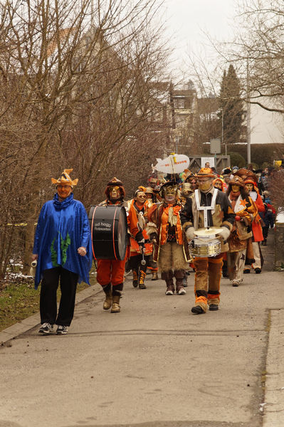 Besammlung auf dem Schulhausplatz, «Cortège» zum Pfarreiheim und in die Wärme zum feiern. Vergnügte Fami-Team Fasnacht.