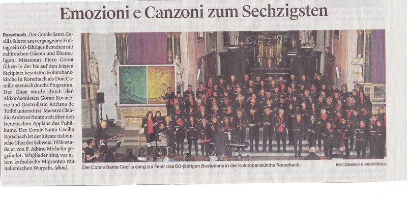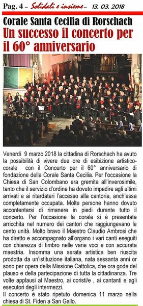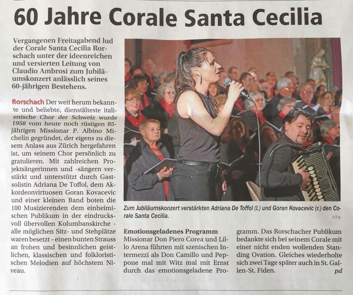 Grandissima partecipazione per i due concerti del 9.3.2018 a Rorschach e 11.3.2018 a Sankt Gallen in onore dei 60 anni di fondazione della Corale Santa Cecilia. Presenti agli eventi centinaia e centinaia di persone tra cui il Vicario Generale della Diocesi di Sankt Gallen, Mons. Guido Scherrer e il fondatore della Corale stessa, Padre Albino Michelin. Spettacolare intrattenimento con la Musica della nostra corale Santa Cecilia... ma la vera notizia è che... Don Camillo e Peppone per una volta non hanno litigato ;)