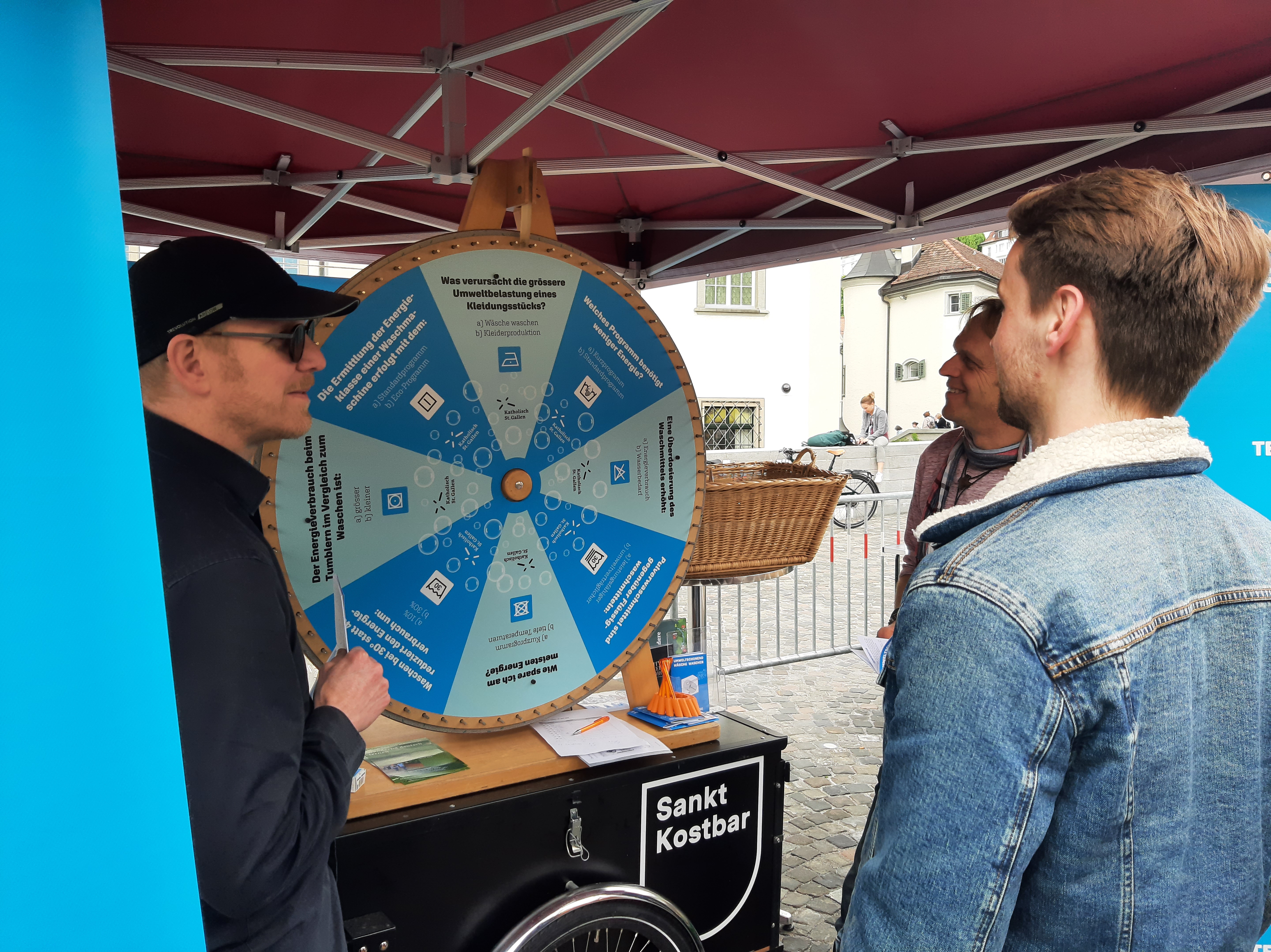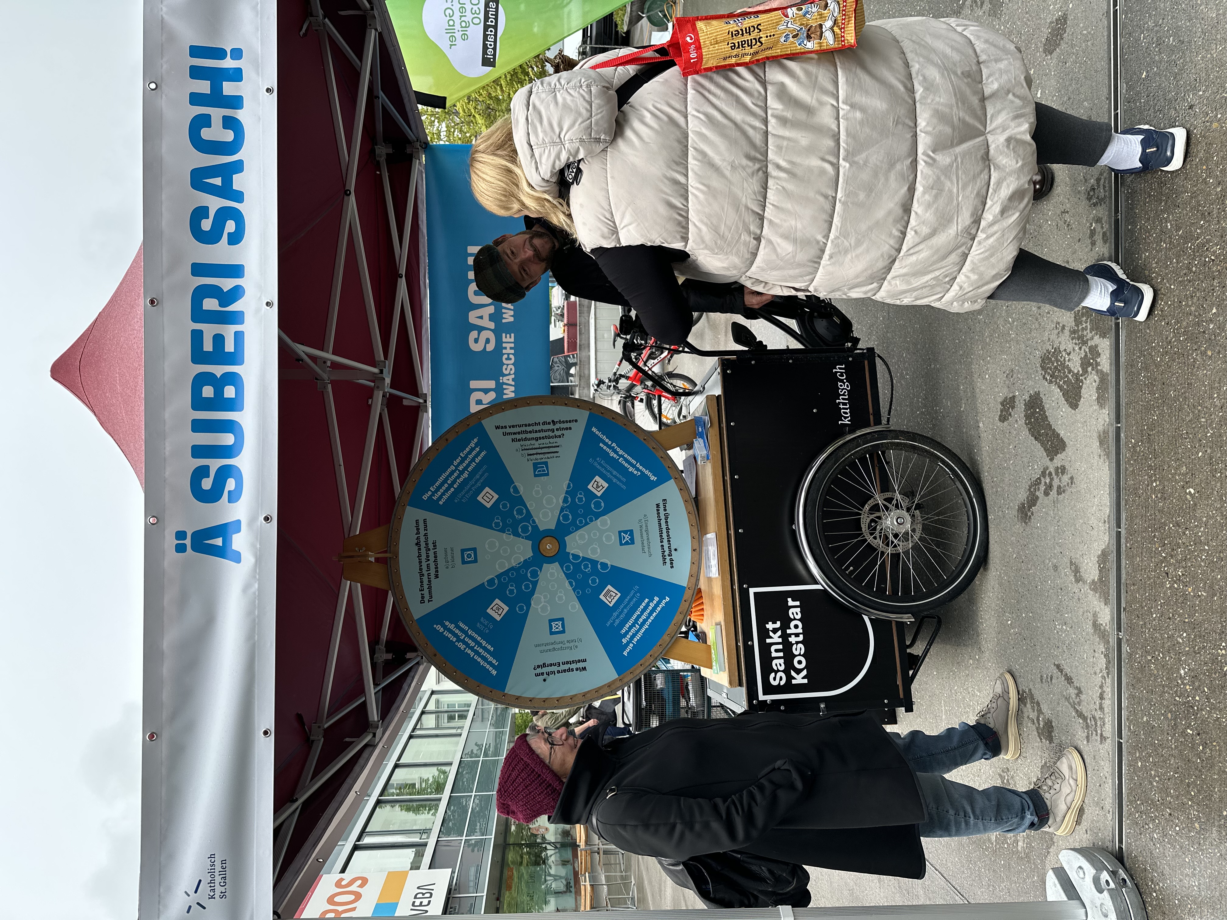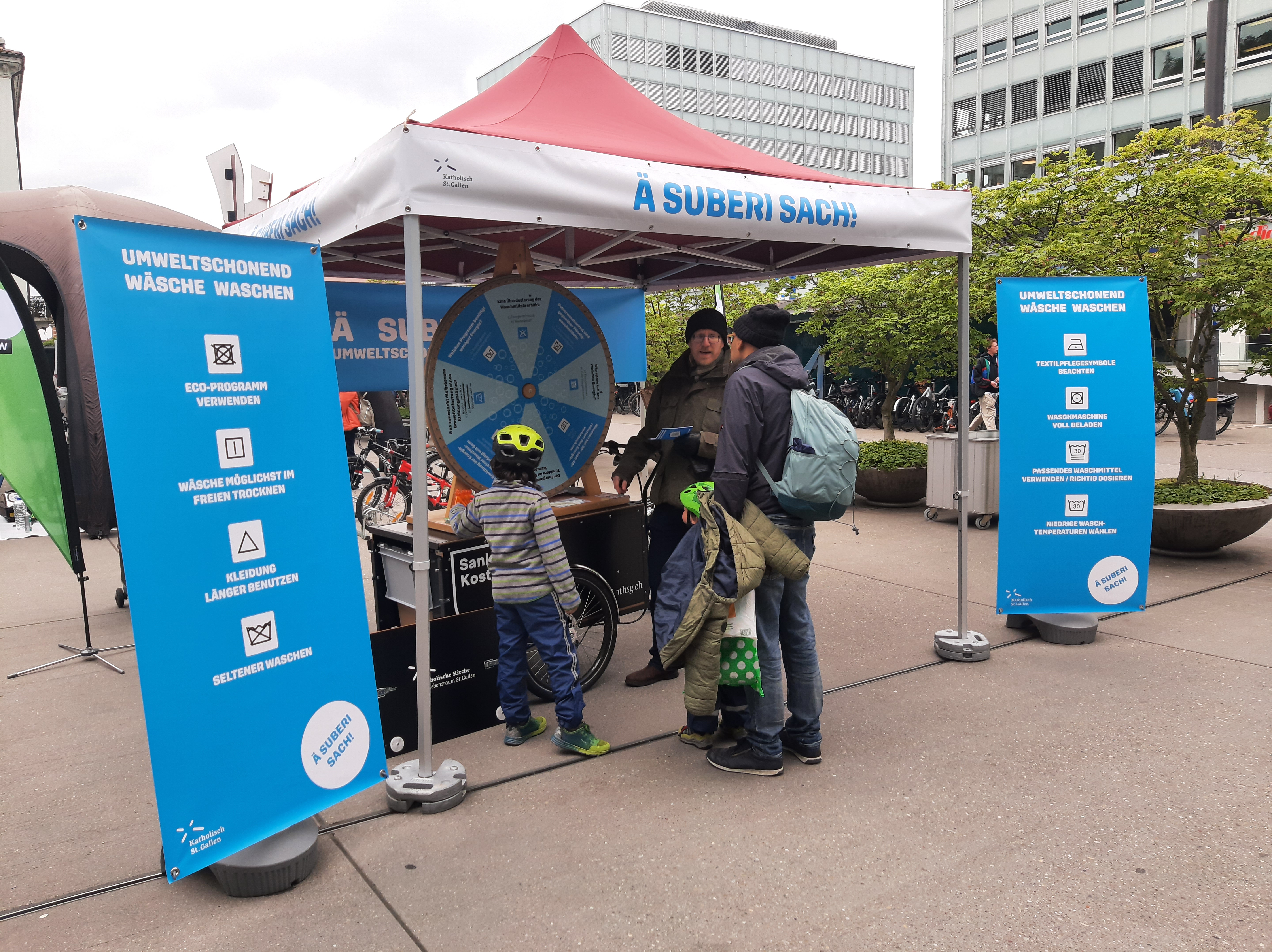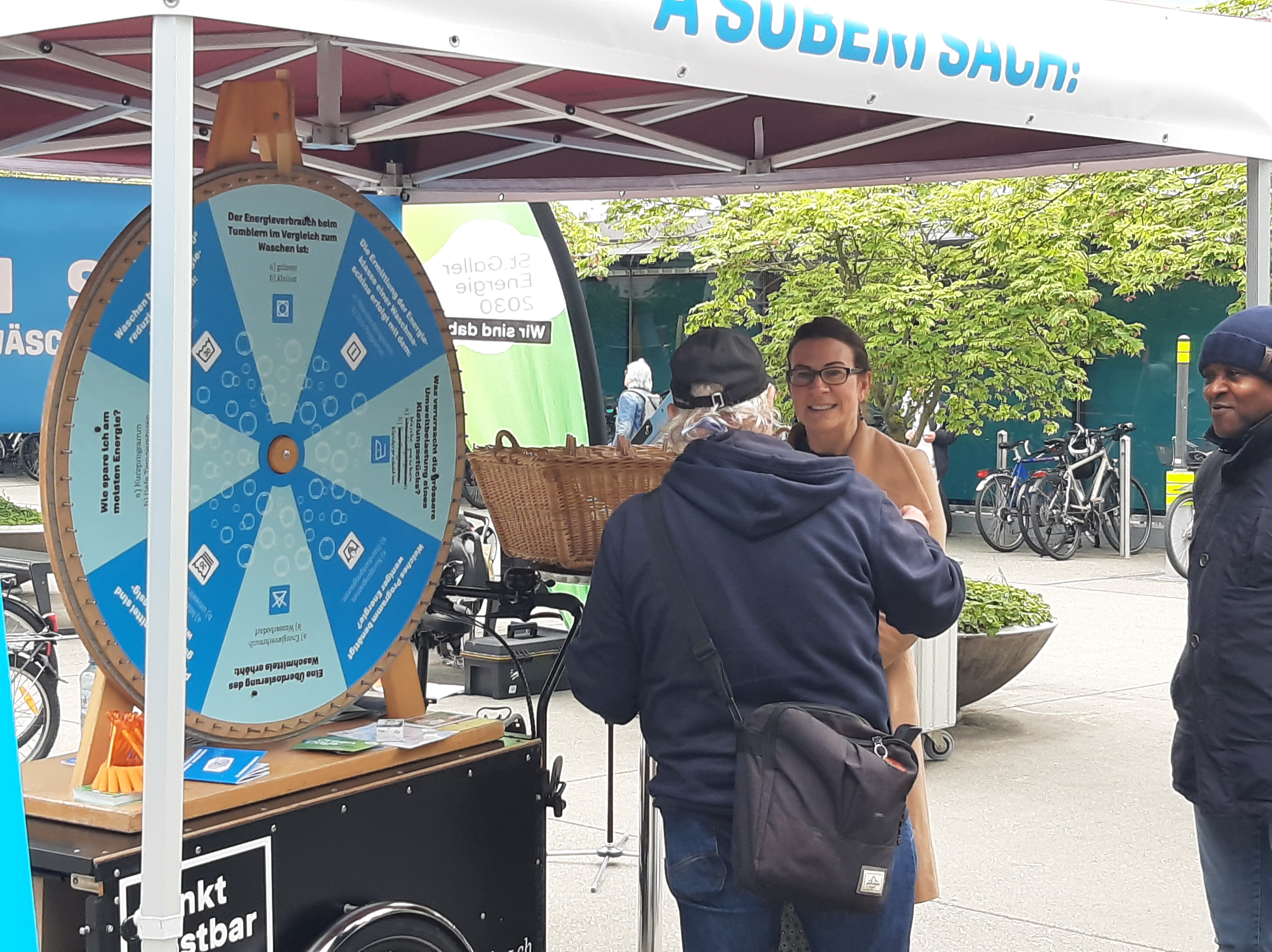 Dieses Jahr hat die Cityseelsorge erstmals an den Green Days mit einer Standaktion teilgenommen. Passend zum Motto der Green Days vermittelten wir praktische Tipps, wie sich beim Wäsche Waschen viel Energie sparen lässt, und dies bei gleichbleibender Wäscheleistung! Beim Glücksrad konnten die Besuchenden ihr Wissen testen und im Gespräch vertiefen. Spontan hat sich die mobile Velowaschanlage aus Gossau dazugesellt. Für einen Tag stand der Vadianplatz somit ganz im Zeichen der energiesparenden Hygiene von Mensch und Zweirad.