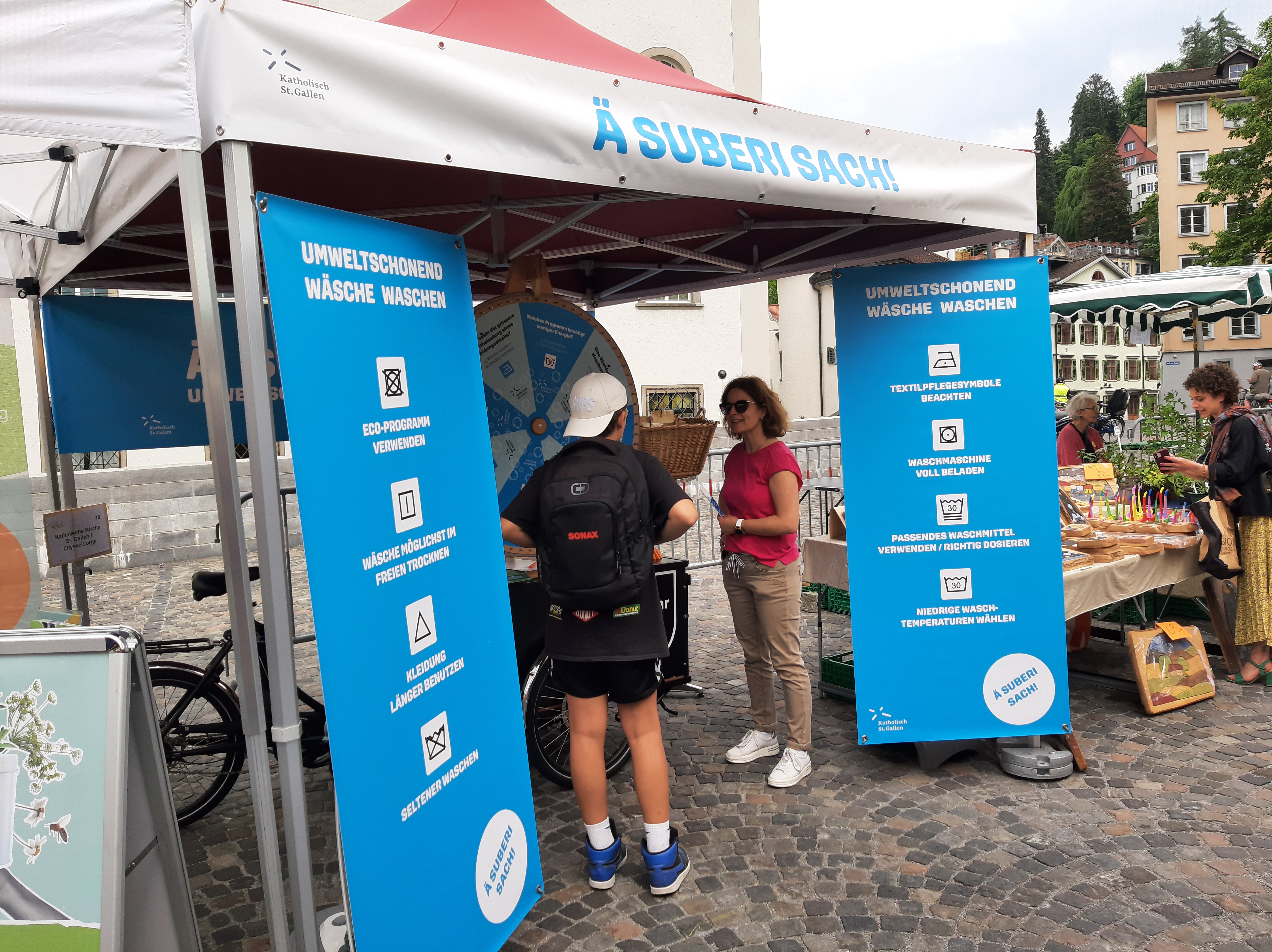 Am diesjährigen Ökomarkt drehte sich am rege besuchten Infostand der Cityseelsorge alles ums umweltschonende Waschen. Die Standbesuchenden erhielten einfach umsetzbare Tipps, wie sie das Wäsche waschen umweltschonender gestalten können. Fragen wie warum das Eco-Programm trotz längerer Laufzeit umweltschonender ist oder was die Vorzüge von Pulver- gegenüber Flüssigwaschmittel sind, führten zu angeregten Diskussionen mit oftmals vielen Aha-Effekten. Beim Glücksrad konnten die Besuchenden ihr Wissen testen und im Gespräch vertiefen. Eine eigens für diesen Anlass erarbeitete Broschüre wurde den Besuchenden, zusammen mit einer Fleckenseife, als Geschenk überreicht.