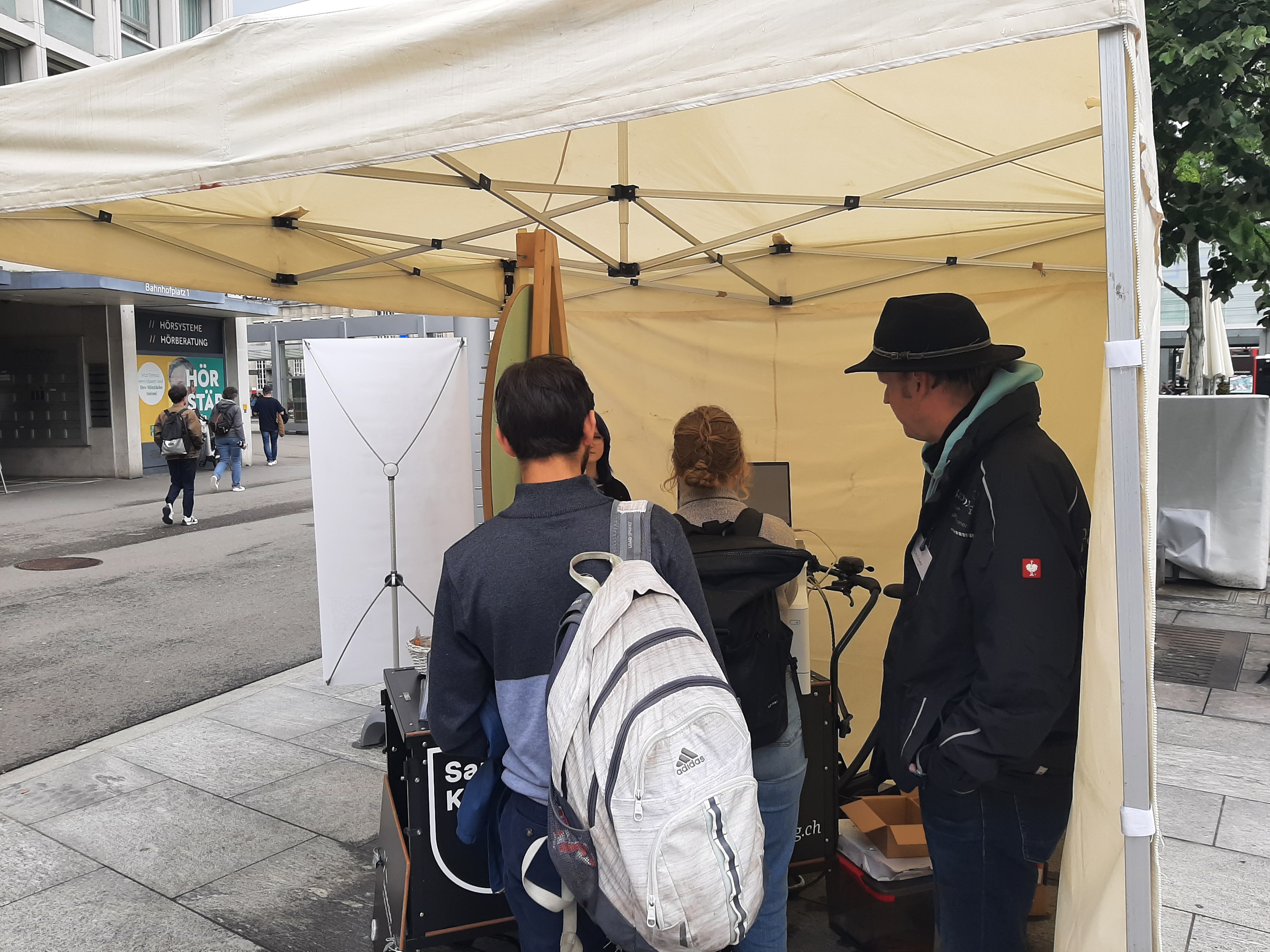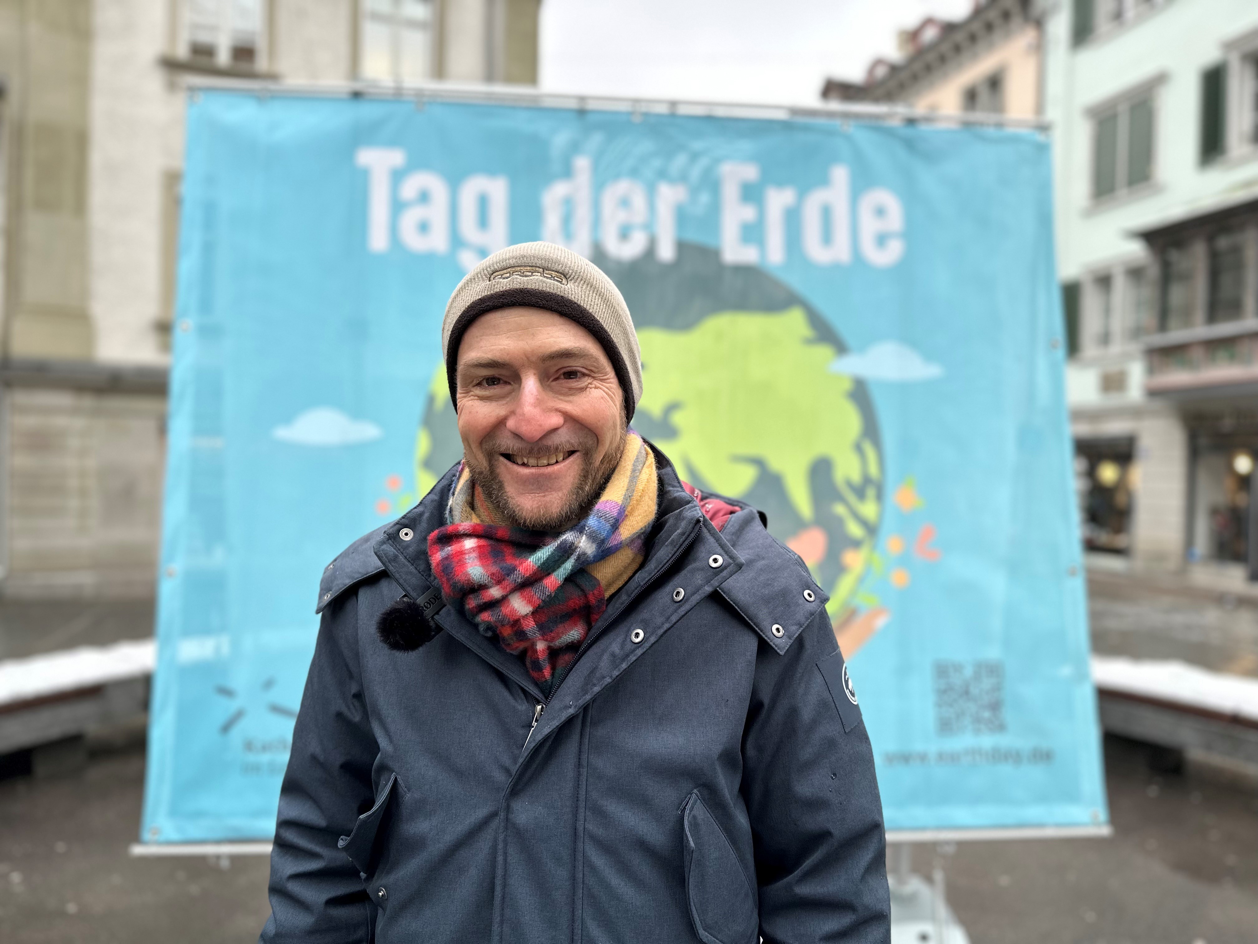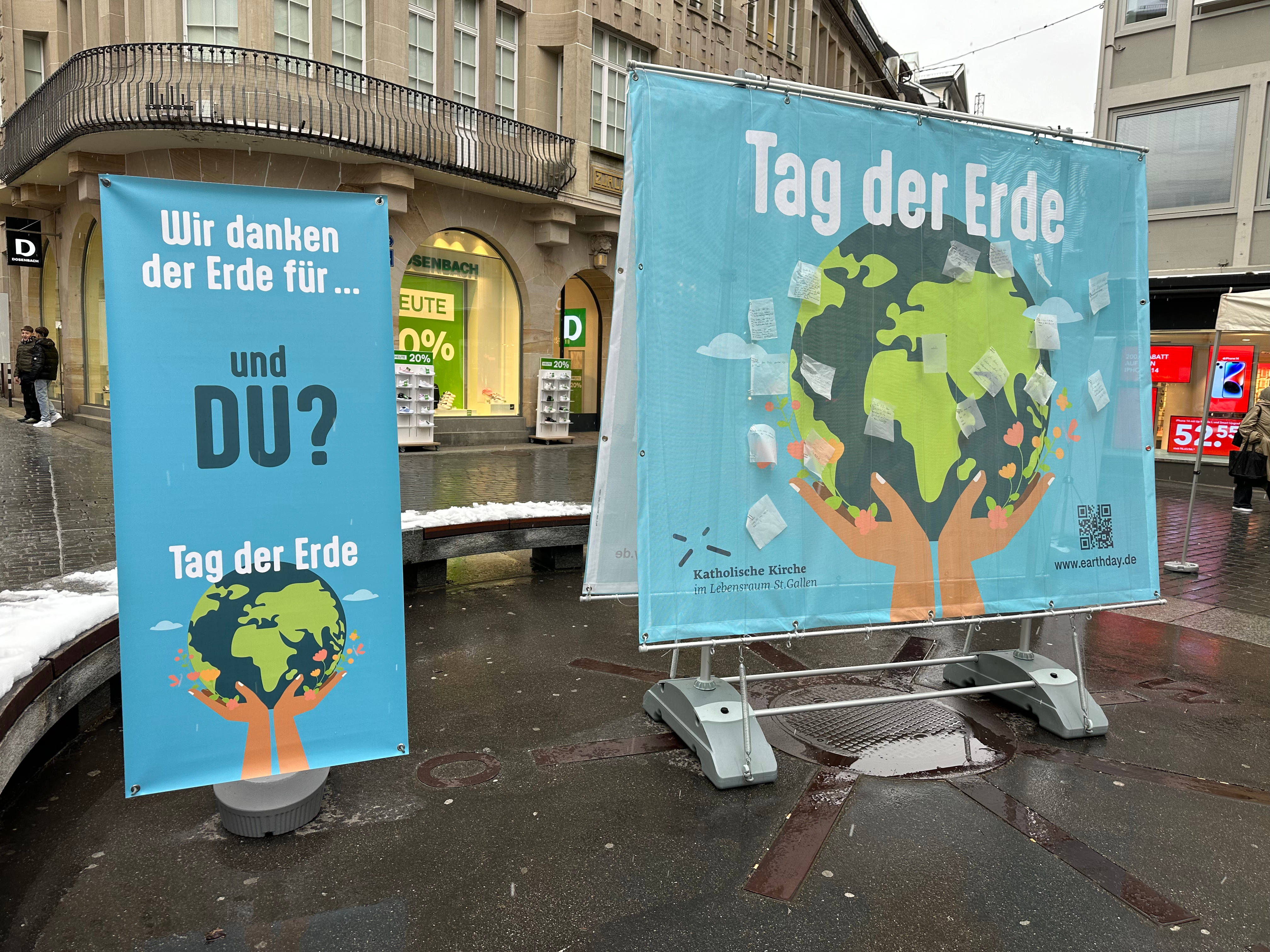 Dank beherzten Freiwilligen konnten wir 2024 am Bärenplatz bei Kälte und Schnee viele Menschen ansprechen und sie dazu bewegen aufzuschreiben, wofür sie der Erde dankbar sind. Die beschrifteten Zettel haben wir dort an unsere grosse Bannerwall gehängt.