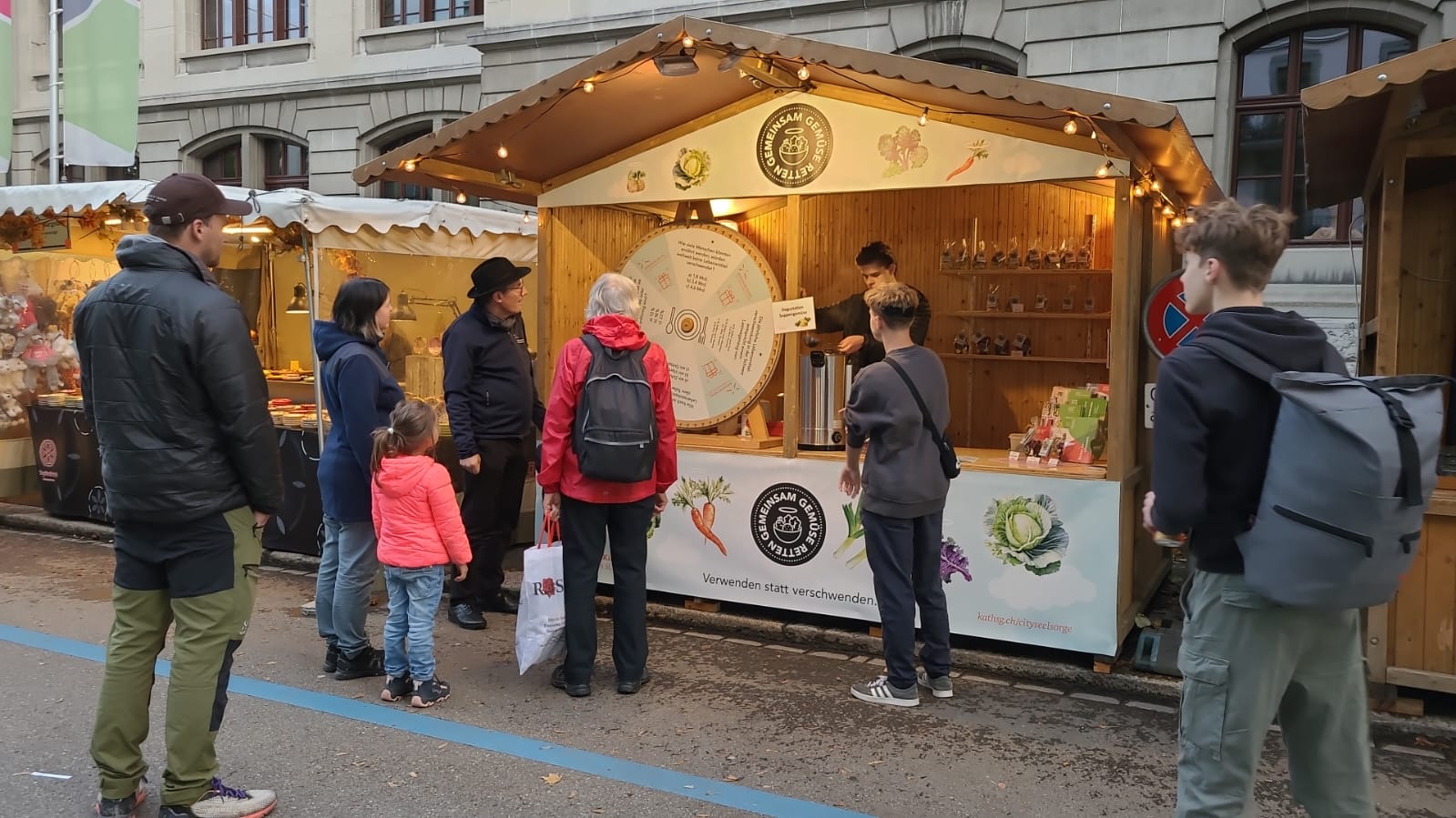 Auch dieses Jahr stand der Auftritt der Cityseelsorge am OLMA-Jahrmarkt ganz im Zeichen von Foodwaste. Der lustvoll gestaltete Marktstand vermittelte das Thema auf spielerische und genussvolle Art. Das Glücksrad mit Fragen rund um die Lebensmittelverschwendung hat Jung und Alt gleichermassen angezogen. Nebst feinen Öpfelringli die es zu gewinnen gab, ergaben sich immer wieder auch anregende Diskussionen rund um das Thema Foodwaste. Das in Zusammenarbeit mit Valida hergestellte Dörrgemüse fand regen Absatz. Diesem qualitativ einwandfreien Zweitklassgemüse wollten wir eine zweite Chance geben, getreu dem Motto: lieber essen als wegwerfen. Wer Lust hatte, konnte sich von der einwandfreien Qualität gleich selbst überzeugen und die ebenso schmackhafte wie wärmende Suppe verkosten.