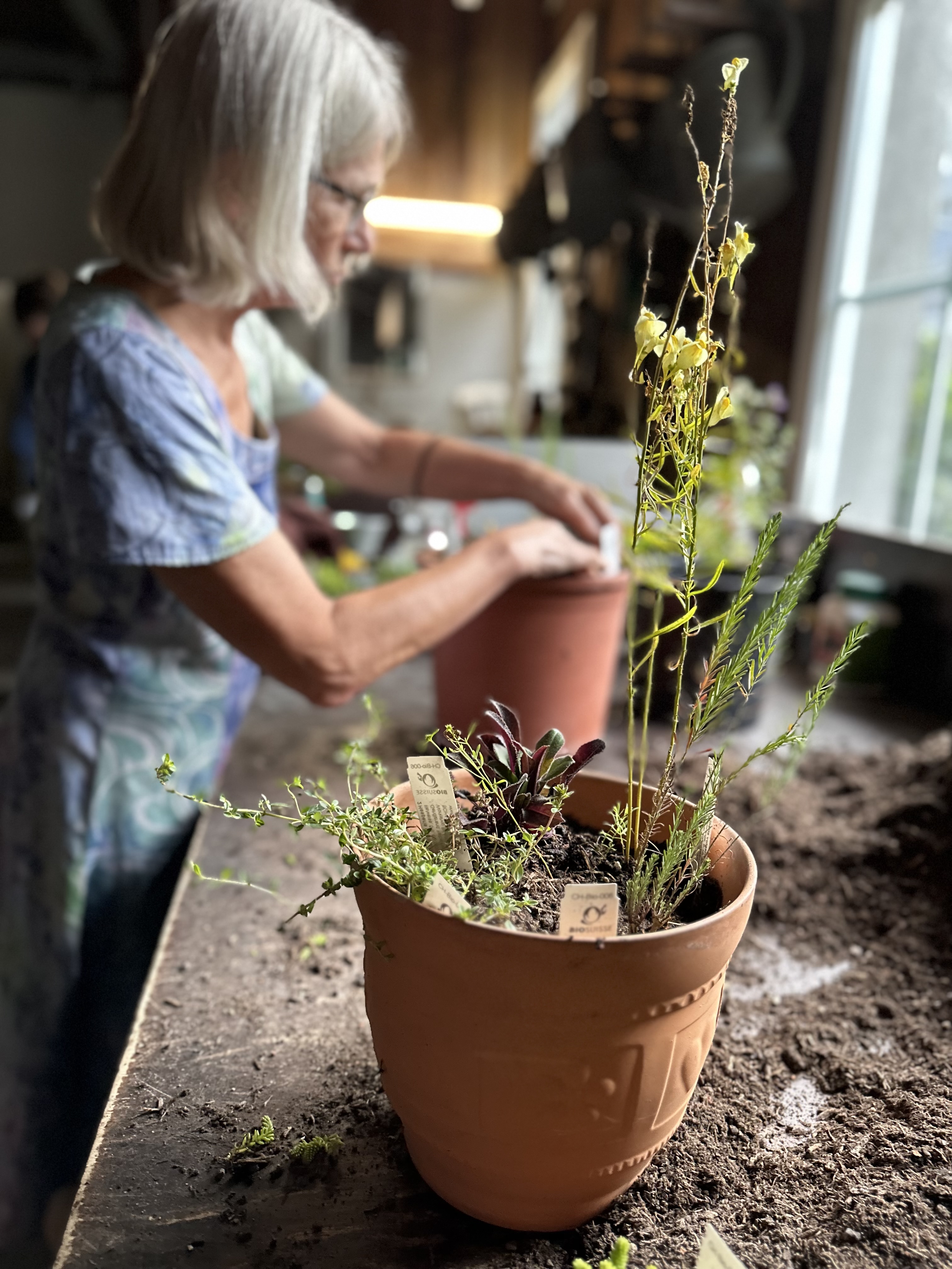 Auch kleine Balkone und Gärten können einen wertvollen Beitrag zur Biodiversität leisten. An einem praxisorientierten Kurs im Botanischen Garten St.Gallen wurde gezeigt, wie Blumentöpfe richtig bepflanzt werden, um Oasen für Bienen und andere Bestäuber zu schaffen. Nach einer kurzen Einführung durch Cora Barth, Geschäftsführerin der Wildblumen GmbH, folgten praktische Anleitungen zur Gestaltung der eigenen Pflanzgefässe. Dabei galt es, nicht nur ästhetische und persönliche Vorlieben, sondern vor allem die standortgerechte Wahl der Pflanzen zu berücksichtigen. Ob sonnig oder schattig ist nicht nur uns Menschen wichtig. Hier half glücklicherweise Cora, damit die richtigen Pflanzen an den richtigen Ort kommen. Zwei Stunden später verliessen zufriedene Gesichter den botanischen Garten, schwer beladen mit Wildblumen bestückten Blumentöpfen
