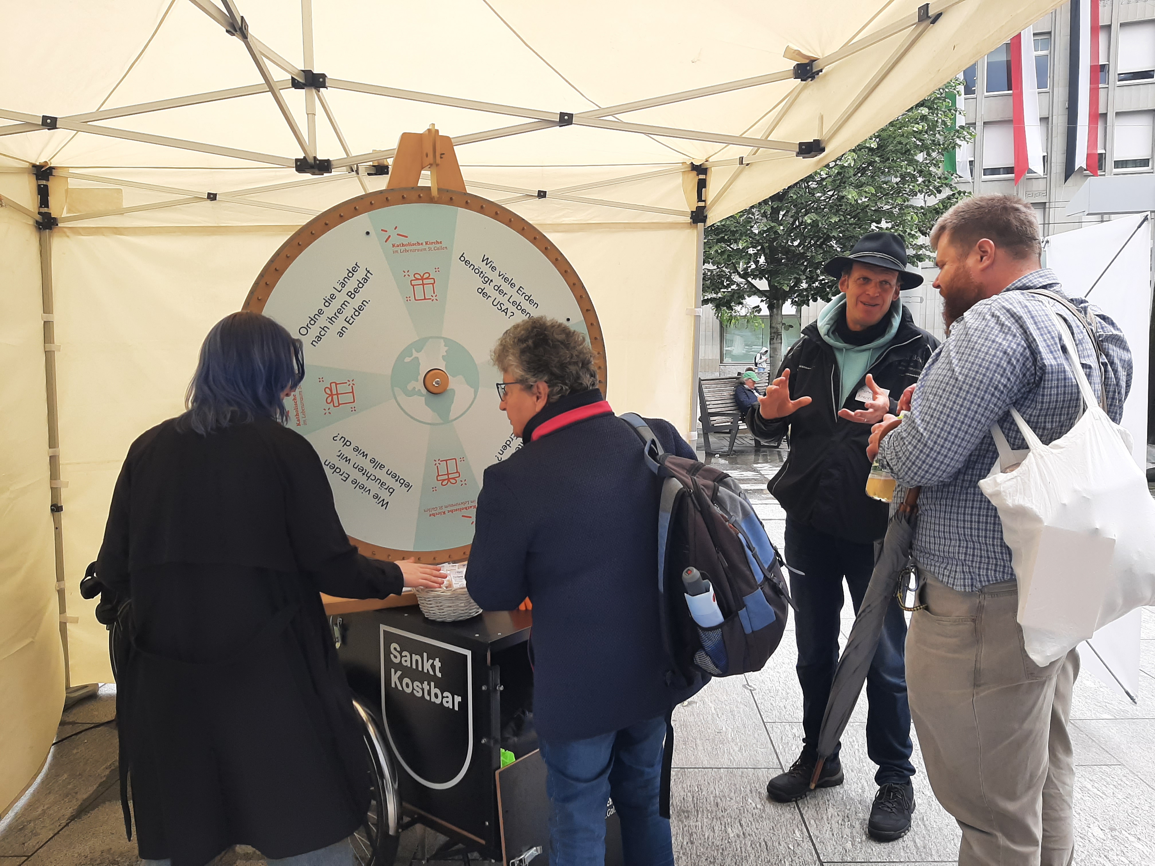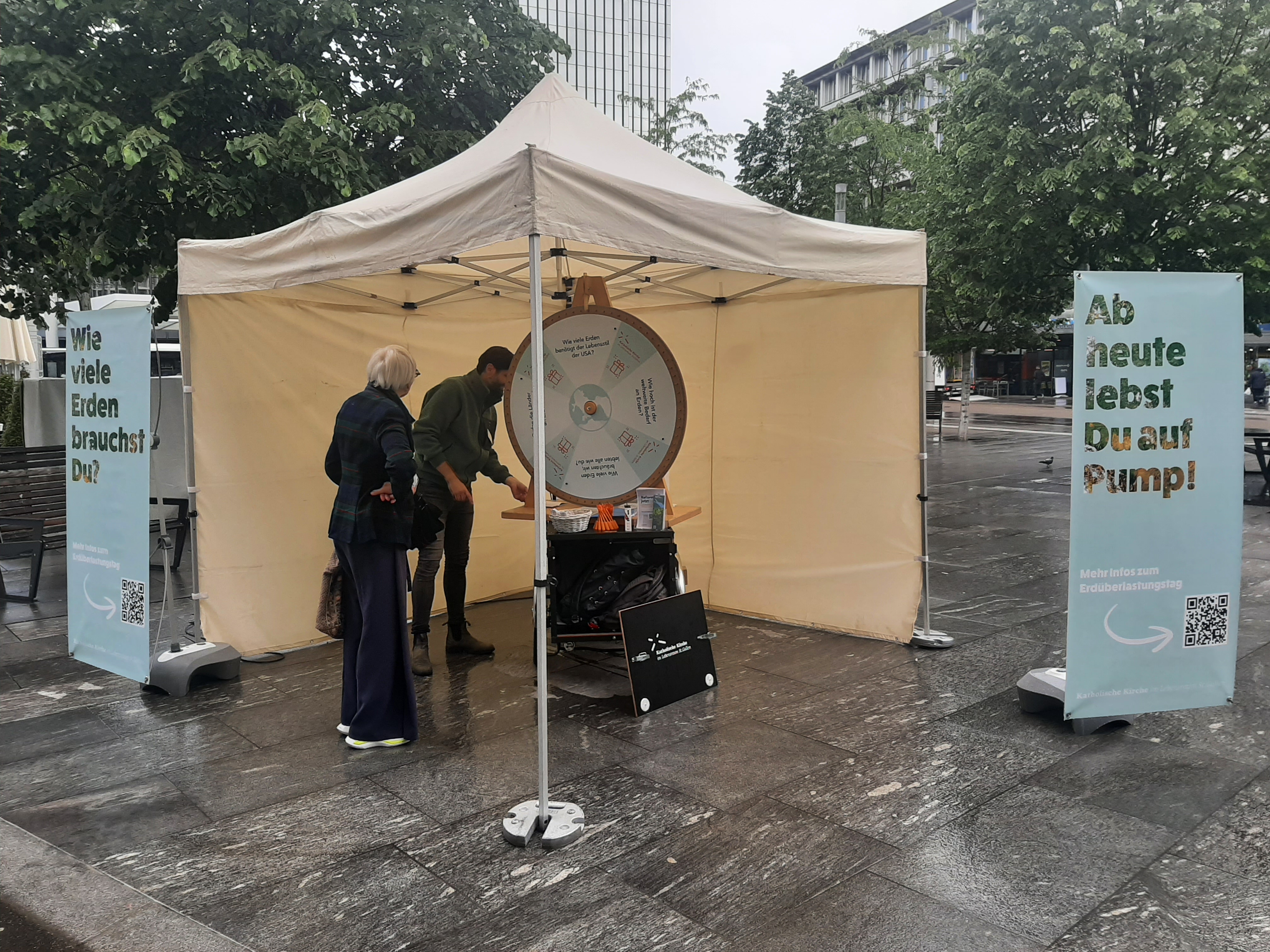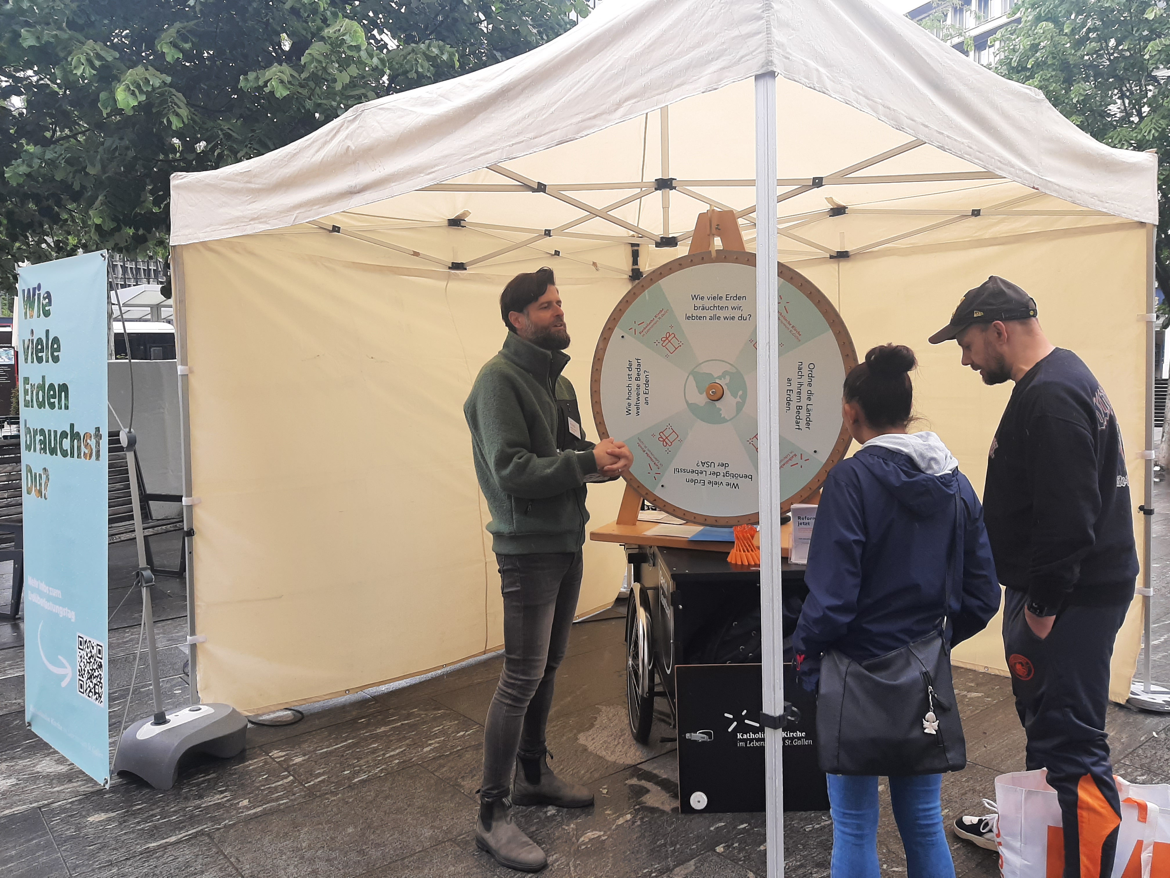 Wir leben seit dem 27. Mai 2024 auf Pump! Dies war die Kernbotschaft am Infostand zum Erdüberlastungstag der Cityseelsorge auf dem Kornhausplatz. Am Glücksrad konnten die Besucher und Besucherinnen ihr Wissen testen. Wer wollte, hatte auch die Möglichkeit, seinen ökologischen Fussabdruck vor Ort zu berechnen. Die nasse Witterung passte zu diesem Frühling. Trotzdem haben sich zahlreiche Personen auf Gespräche eingelassen oder wollten ihre Fortune am Glücksrad versuchen. Dass sich die Kirche für dieses Anliegen stark macht wurde positiv wahrgenommen und sehr geschätzt.