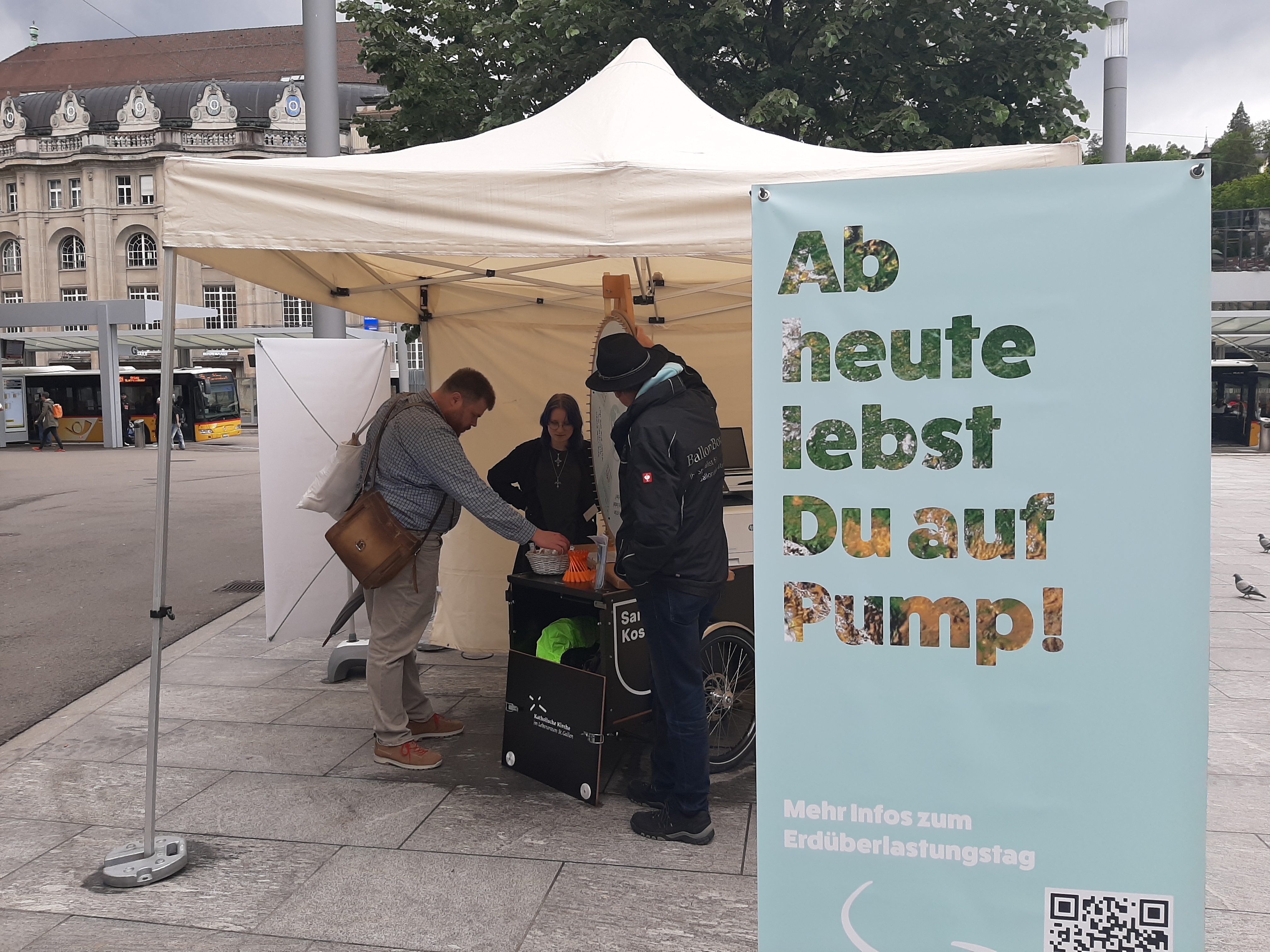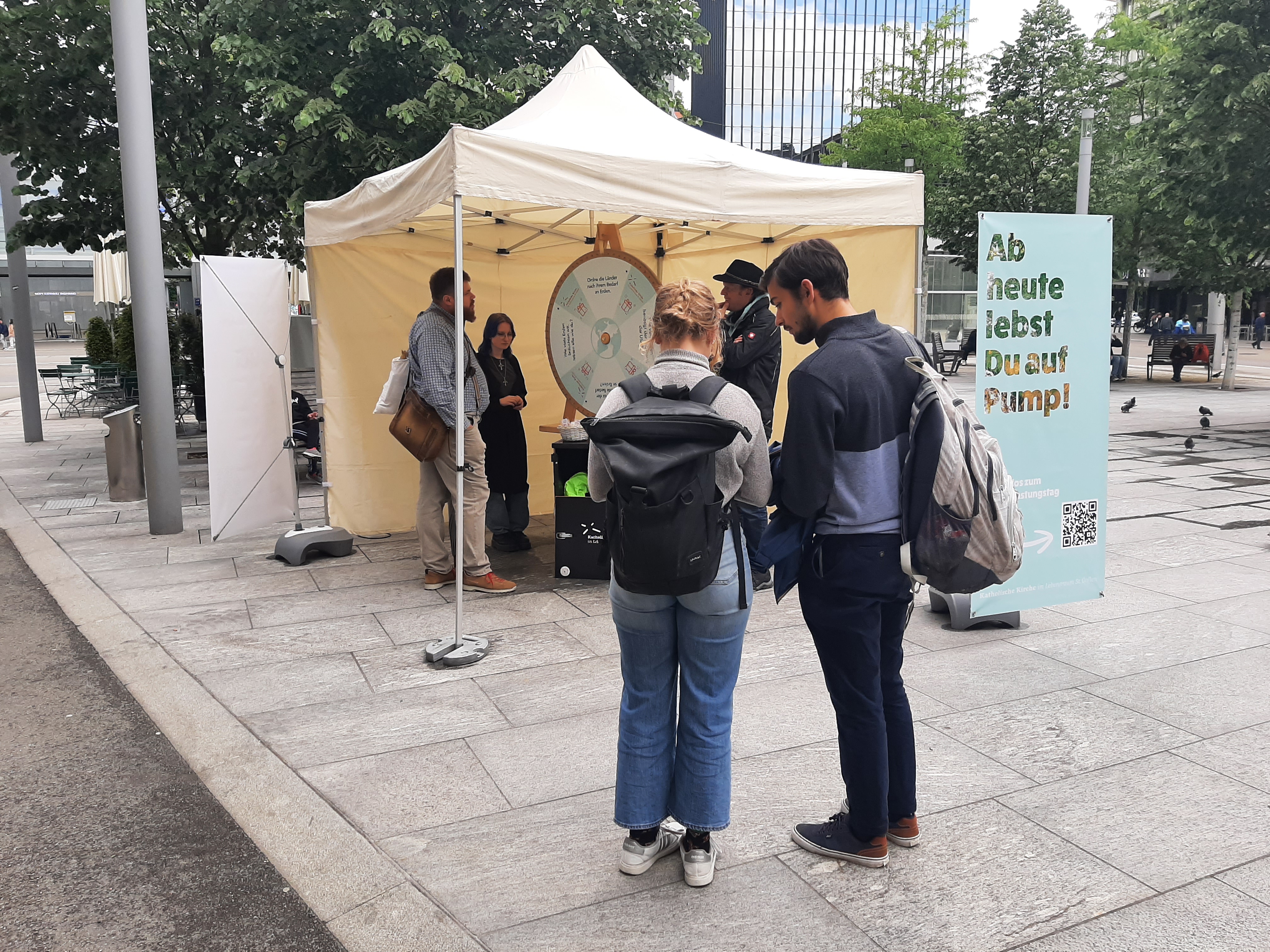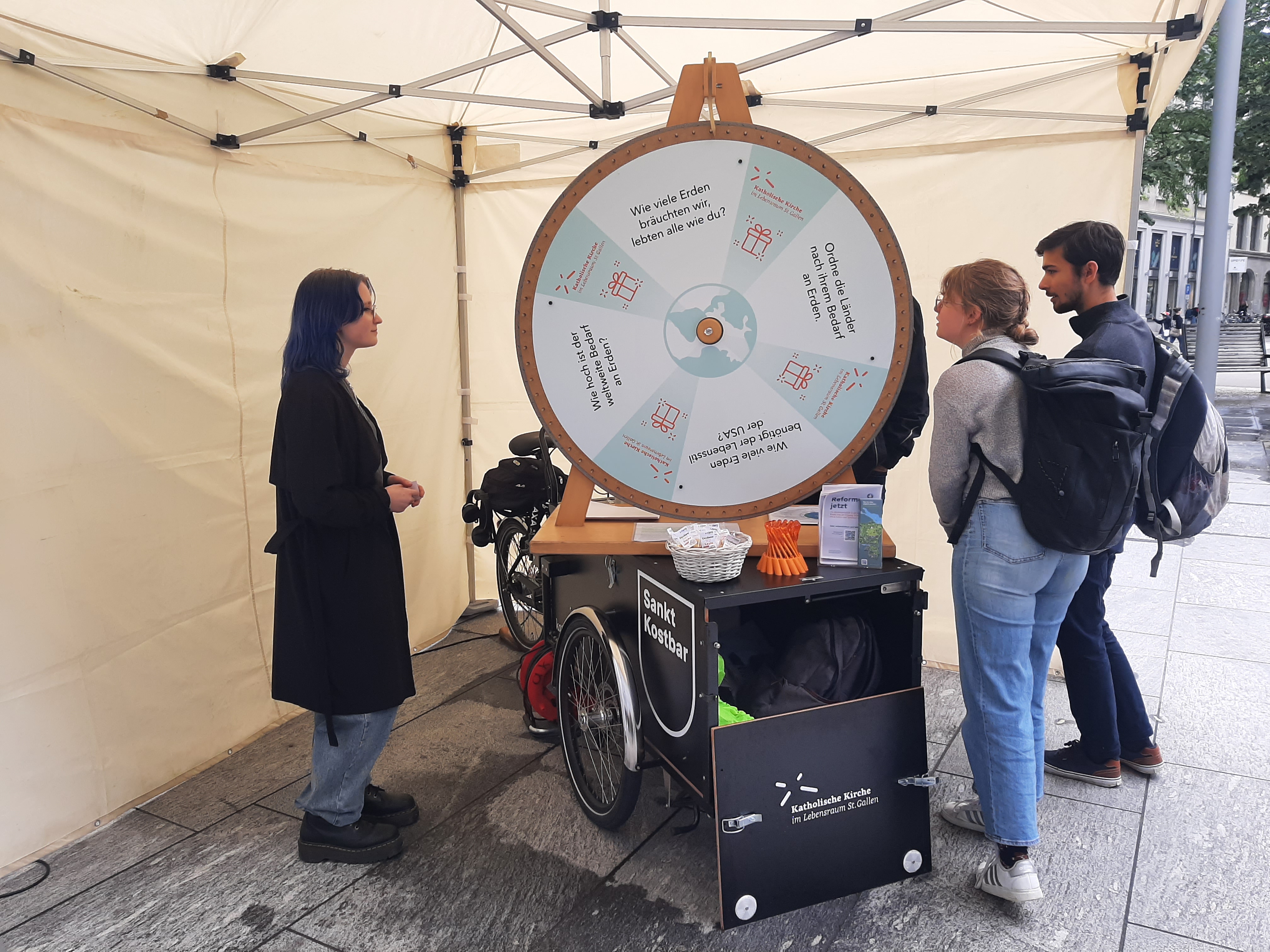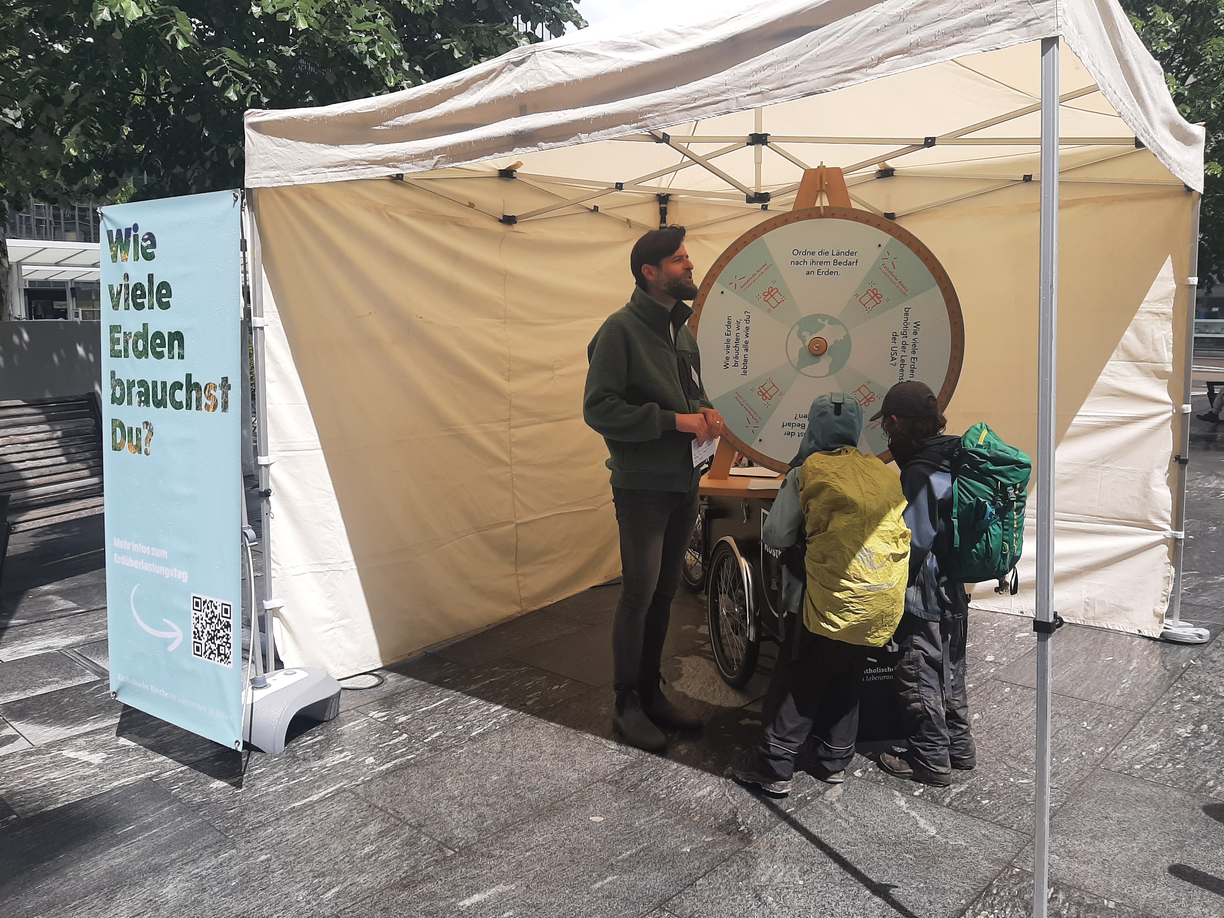Wir leben seit dem 27. Mai 2024 auf Pump! Dies war die Kernbotschaft am Infostand zum Erdüberlastungstag der Cityseelsorge auf dem Kornhausplatz. Am Glücksrad konnten die Besucher und Besucherinnen ihr Wissen testen. Wer wollte, hatte auch die Möglichkeit, seinen ökologischen Fussabdruck vor Ort zu berechnen. Die nasse Witterung passte zu diesem Frühling. Trotzdem haben sich zahlreiche Personen auf Gespräche eingelassen oder wollten ihre Fortune am Glücksrad versuchen. Dass sich die Kirche für dieses Anliegen stark macht wurde positiv wahrgenommen und sehr geschätzt.