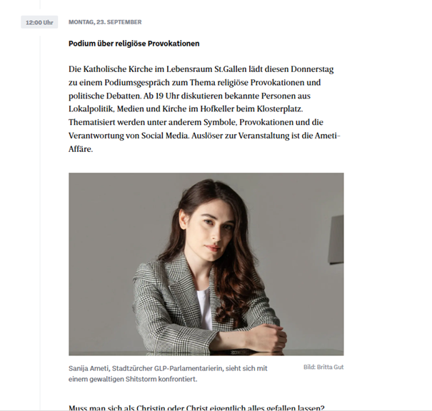 kath.ch: «St. Galler Podium zu Ametis Schiessaktion: Wird das Christentum an die Wand gefahren?» |